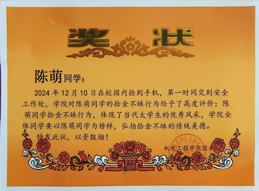 2024年12月10日,beat365在线唯一官网电气工程及其自动化专业2302班陈萌同学,在校园内捡到一部价值 3000元的手机,并第一时间交到安全工作处。当日安全工作处工作人员将手机归还了失主。