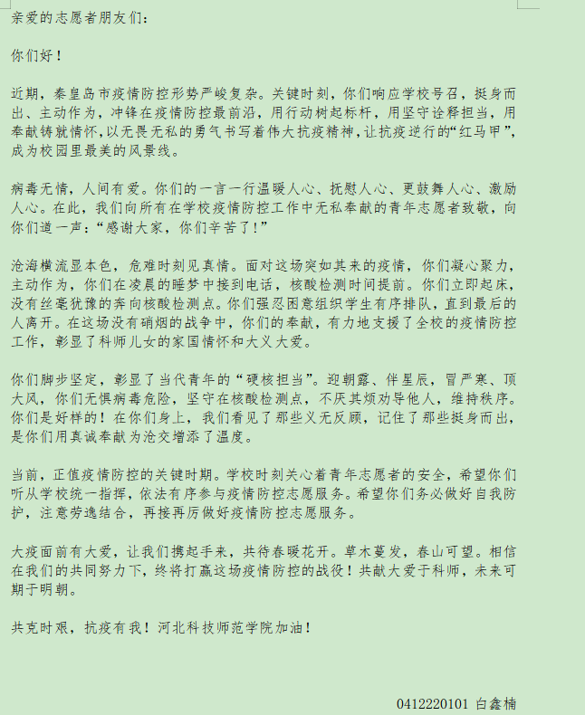为了广泛弘扬“奉献、友爱、互助、进步”志愿精神,beat365在线唯一官网青年志愿者协会于2022年11月—12月举办了“志青春,愿常在”活动。该活动通过结合青年志愿者工作实际,展播志愿者主题文字类、图片类、视频类作品,充分发挥了志愿服务先进典型的示范带头作用,着力展现青年志愿者服务大局、奉献社会、引领成长的青春风采。