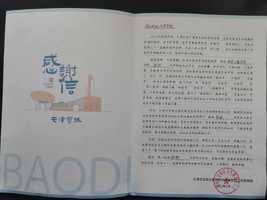 近日,beat365在线唯一官网19机制张帆同学因在属地积极投身疫情防控志愿者队伍,天津市宝坻区疫情防控指挥部特发来感谢信。