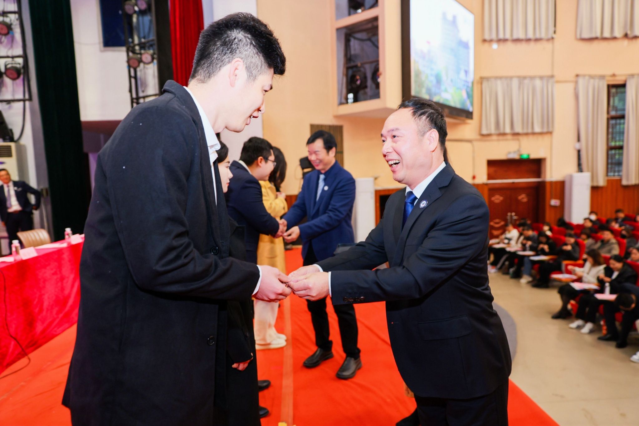 学校领导向新生代表赠送校徽