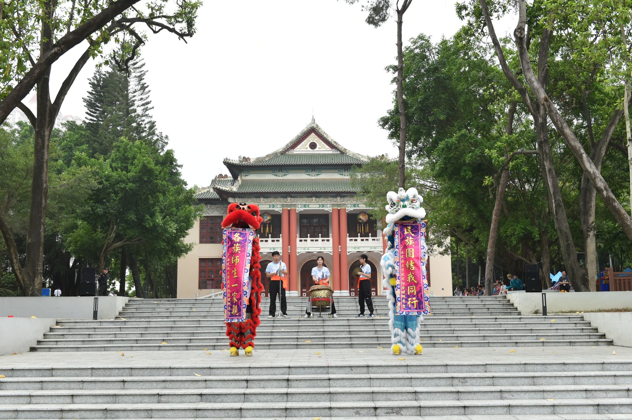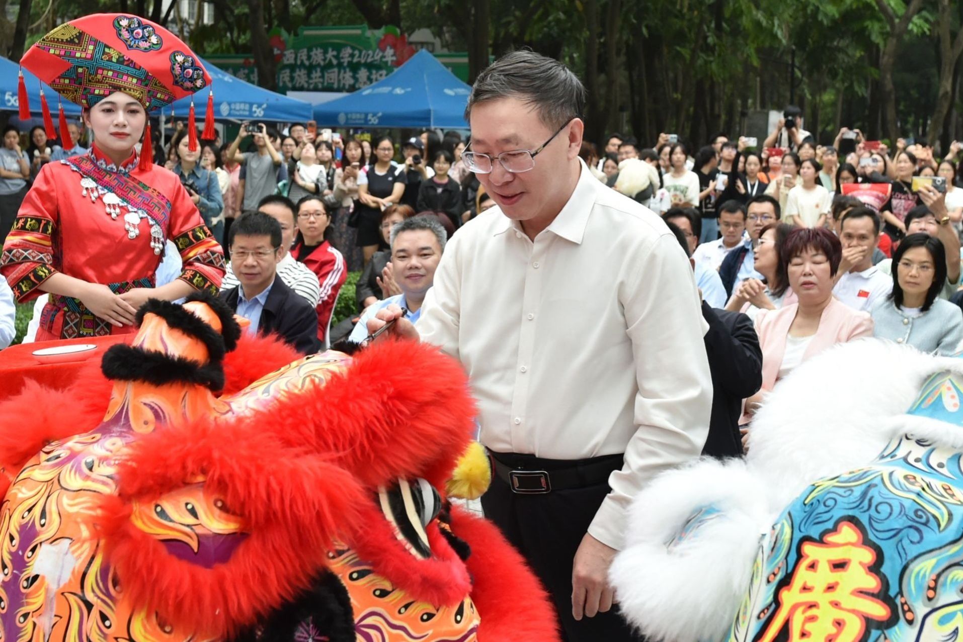 beat365英国官方网站党委书记卞成林,校长韦仕珍为迎宾双狮点睛,活动正式拉开帷幕。鼓点铿锵有力,两头狮子时而嬉戏打闹,时而摇头摆尾,时而翘首仰视,动作俏皮可爱。随着鼓声大震,狮口中的对联顺势展开——各族师生一家亲,民族团结我同行,现场迅速升温。