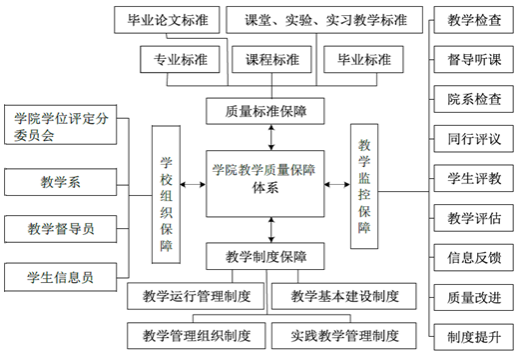 学院在学校“四查、四评、一平台”教学质量保障和监控体系的基础上,结合学院的特点,以不断提升教学质量为目标,将目标管理和过程管理有机结合,并在教学过程中不断健全和完善,建立了以学院、教学系、实验教学中心三位一体、老师和院系领导全员参与、全程监控的质量保障管理体系。