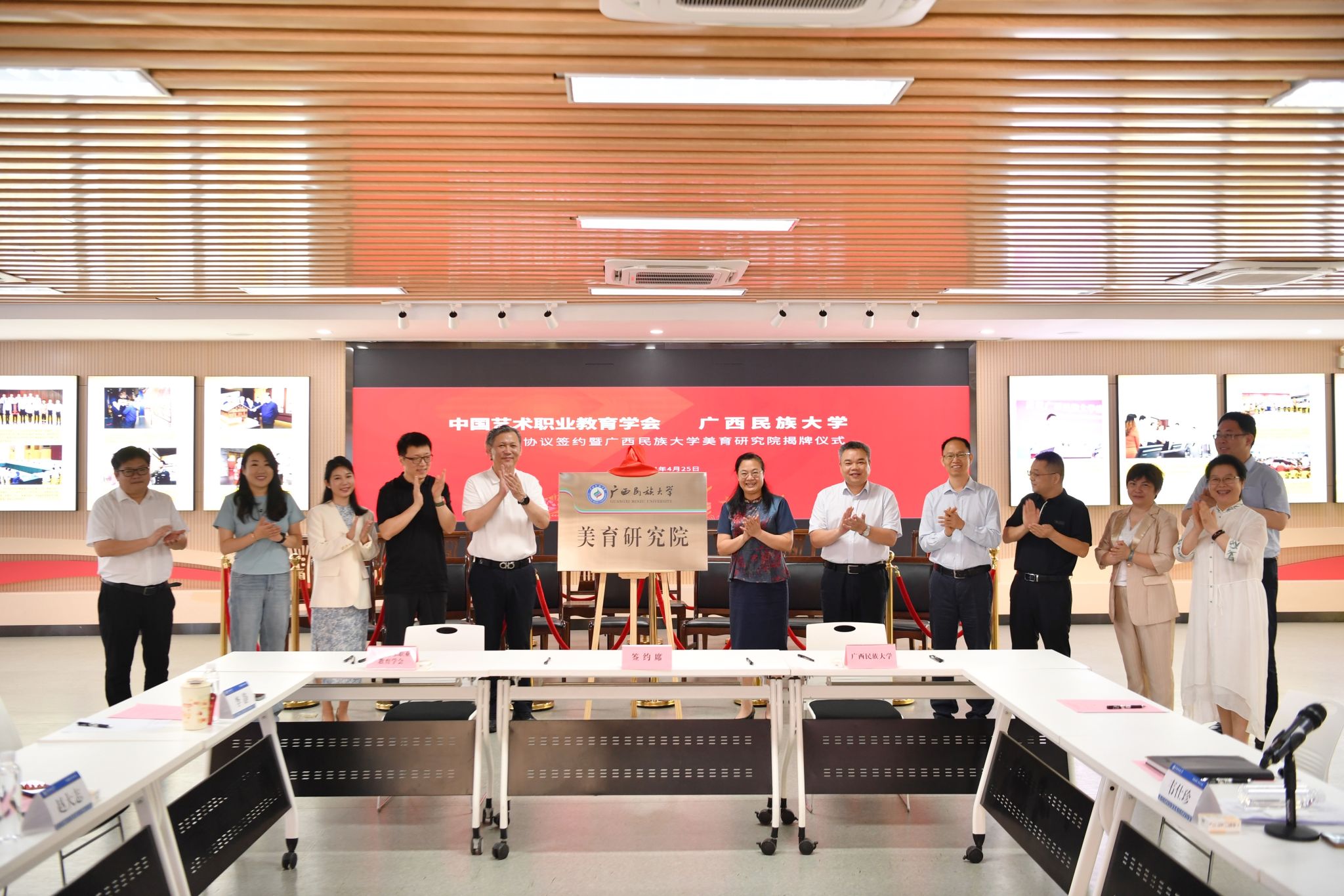 【大学生通讯社报道】4月25日上午,beat365英国官方网站美育研究院揭牌仪式在新时代“我与祖国共成长”党团主题活动文明实践所举行。beat365英国官方网站校长韦仕珍,中国艺术职业教育学会会长王丰签订合作框架协议,共同为beat365英国官方网站美育研究院揭牌。校党委副书记陈铭彬主持活动。