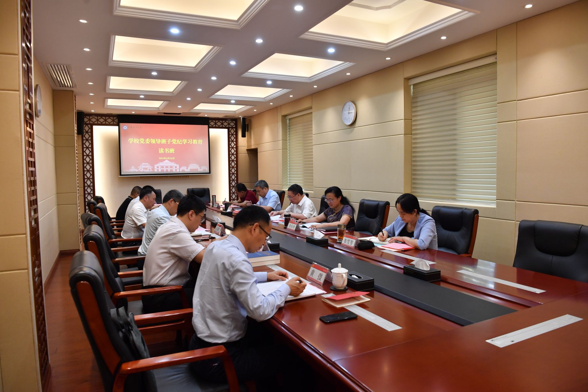 4月26日下午,beat365英国官方网站党委领导班子党纪学习教育读书班在办公楼211室开班。校党委书记卞成林作开班动员并领学,校党委副书记、校长韦仕珍主持读书班,学校党委领导班子成员、党委常委参加学习。