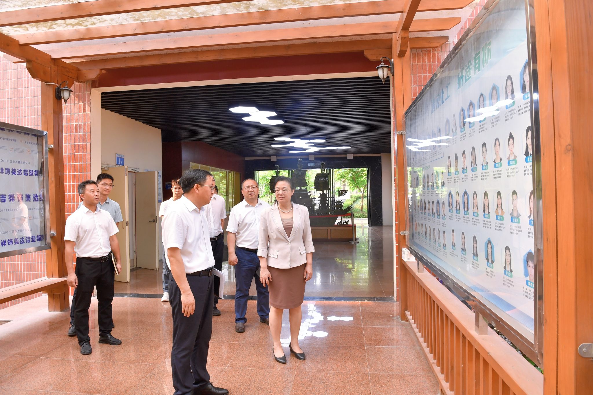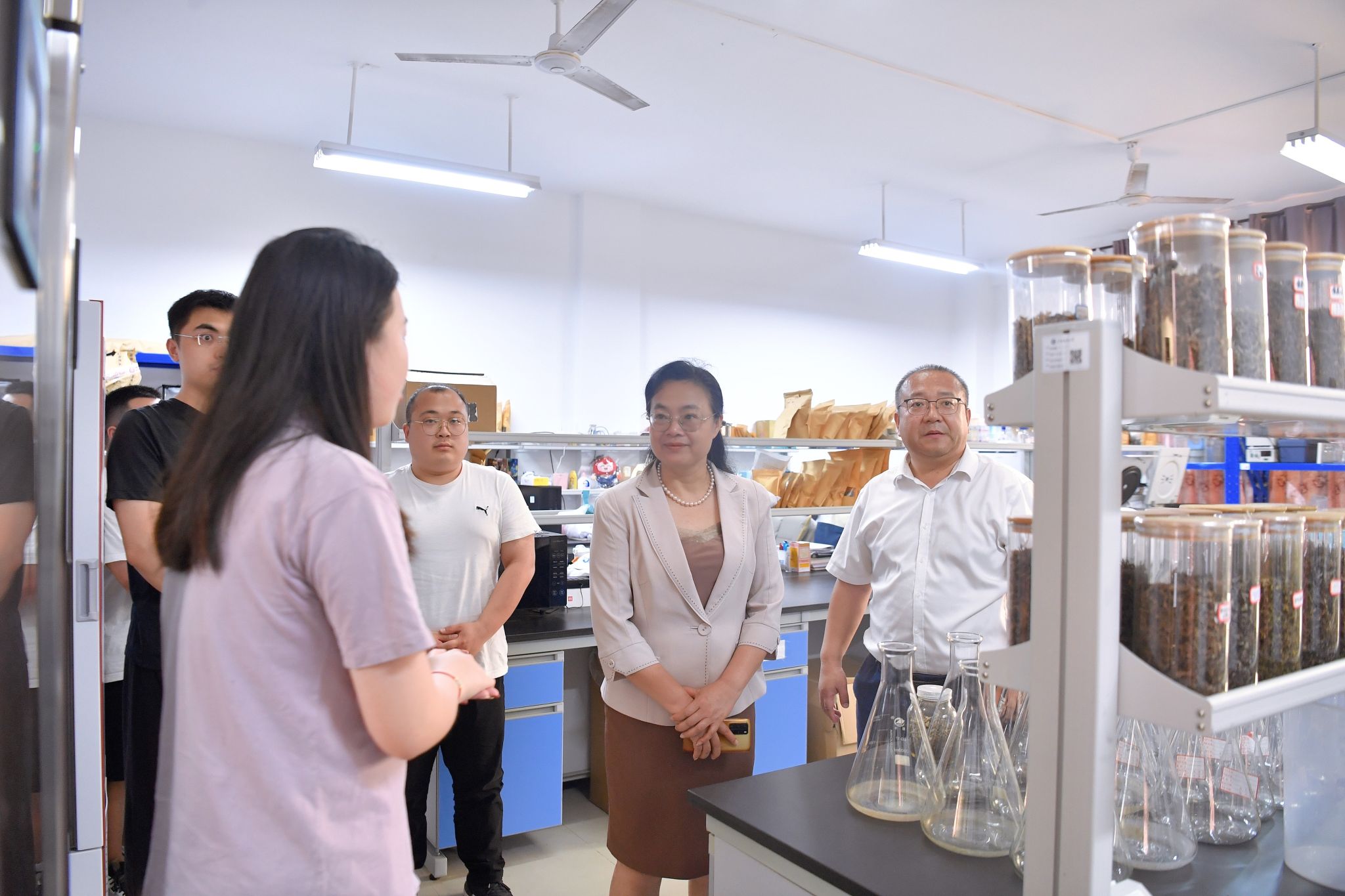 韦仕珍先后参观海洋与生物技术学院广西六堡茶加工工程技术研究中心,化学化工学院场发射扫描电镜室、无机化学实验室,了解学院教学、科研成果和实验室建设情况。