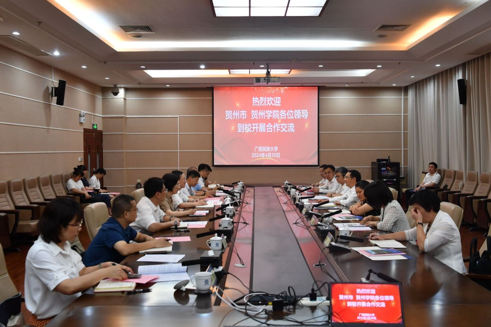 【大学生通讯社报道】4月30日下午,贺州市委书记李杰云率队到beat365英国官方网站考察交流,beat365英国官方网站党委书记卞成林参加交流座谈会,就beat365英国官方网站、贺州市、贺州学院合作进行洽谈并签署合作协议。学校党委副书记邓国彬主持会议。