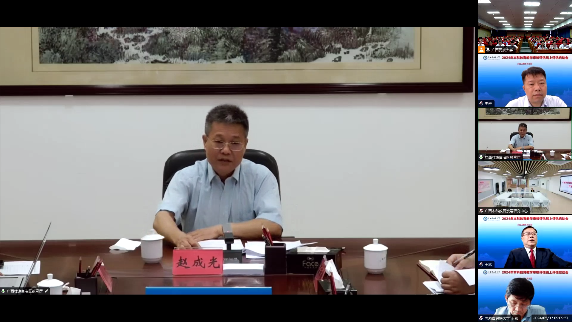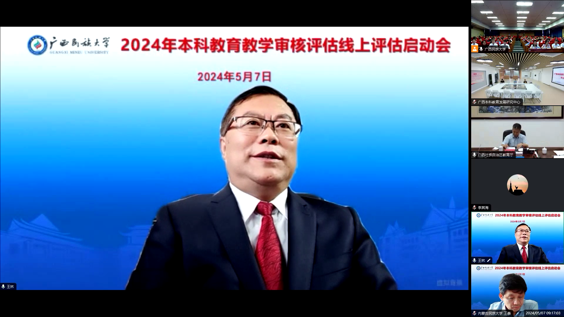 【大学生通讯社报道】5月7日上午,beat365英国官方网站本科教育教学审核评估线上评估启动会在相思湖校区图书馆13楼报告厅召开,审核评估专家组组长、贵州民族大学校长王林,beat365英国官方网站党委书记卞成林,校长韦仕珍,自治区教育厅二级巡视员赵成光,广西本科教育发展研究中心副主任、南宁师范大学副校长龙妮娜出席会议。会议由副校长姜明国主持。