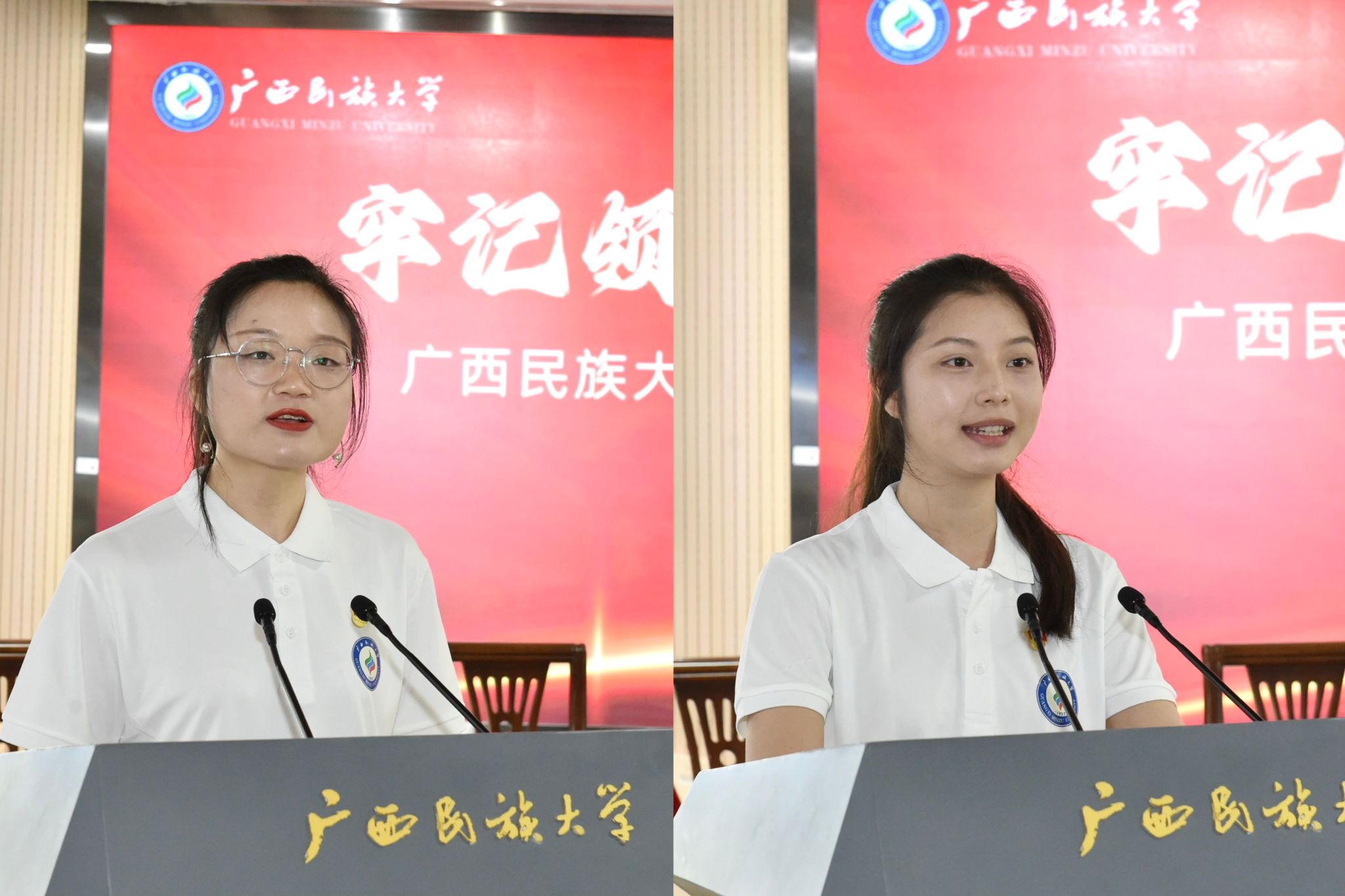 科研工作青年代表、广西中华民族共同体意识研究院2022级博士生程凡,团十九大代表、马克思主义学院2021级硕士生罗明毅作分享