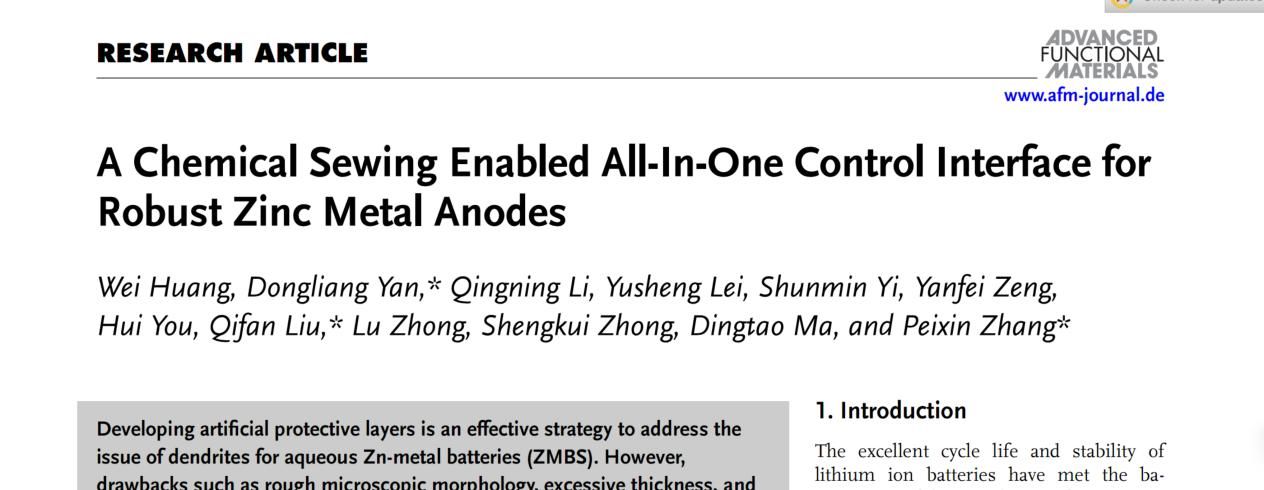 近日,我校材料与环境学院颜东亮教授团队与深圳大学张培新教授团队合作在锌离子电池研究领域取得重要研究进展,相关研究成果以“A chemical sewing enabled all-in-one control interface for robust zinc metal anodes”为题发表在材料学国际权威期刊Advanced Functional Materials上,这是我校以第一完成单位、第一通讯单位在该期刊上发表的研究成果。
