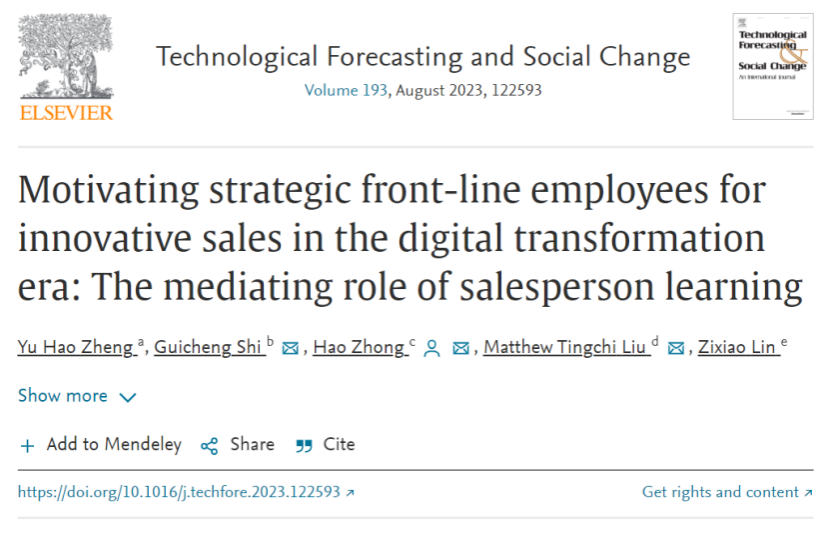 近日,beat365英国官方网站管理学院工商管理系郑宇豪博士在国际权威期刊Technological Forecasting and Social Change(《技术预测与社会变革》)以第一作者身份发表其研究成果Motivating strategic front-line employees for innovative sales in the digital transformation era: The mediating role of salesperson learning(《在数字化转型时代对策略性一线员工创新销售的激励研究:销售人员学习的中介作用》)。该研究的发表向全世界展示了来自中国广西的旅游企业在应对数字化转型方面的优秀经验与成果。