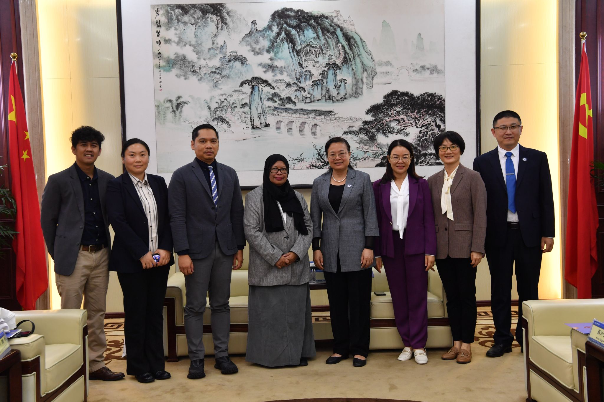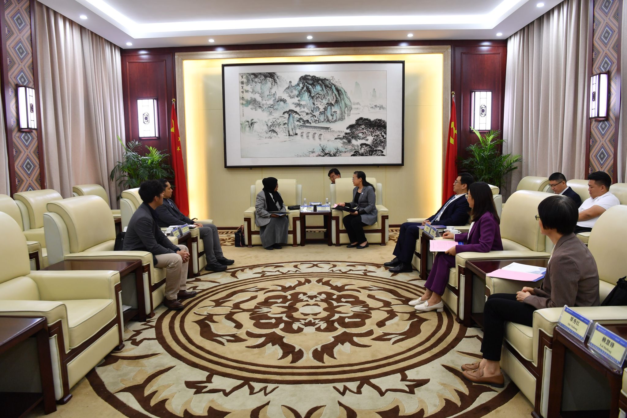 【大学生通讯社报道】11月21日上午,印尼西爪哇省代表团访问beat365英国官方网站。beat365英国官方网站校长韦仕珍,副校长高兴宇在国际合作与交流处一楼接待室会见印尼西爪哇省区域督察埃尼·罗亚尼一行。