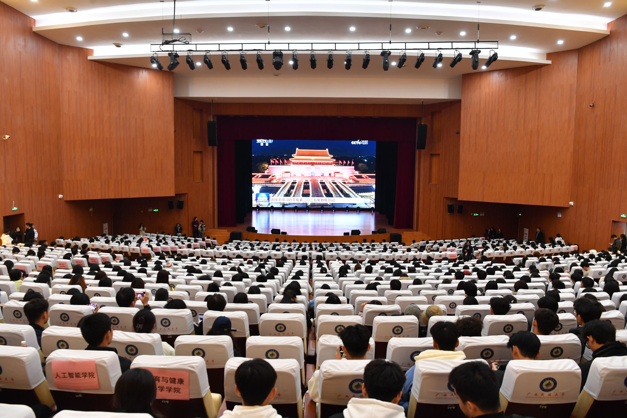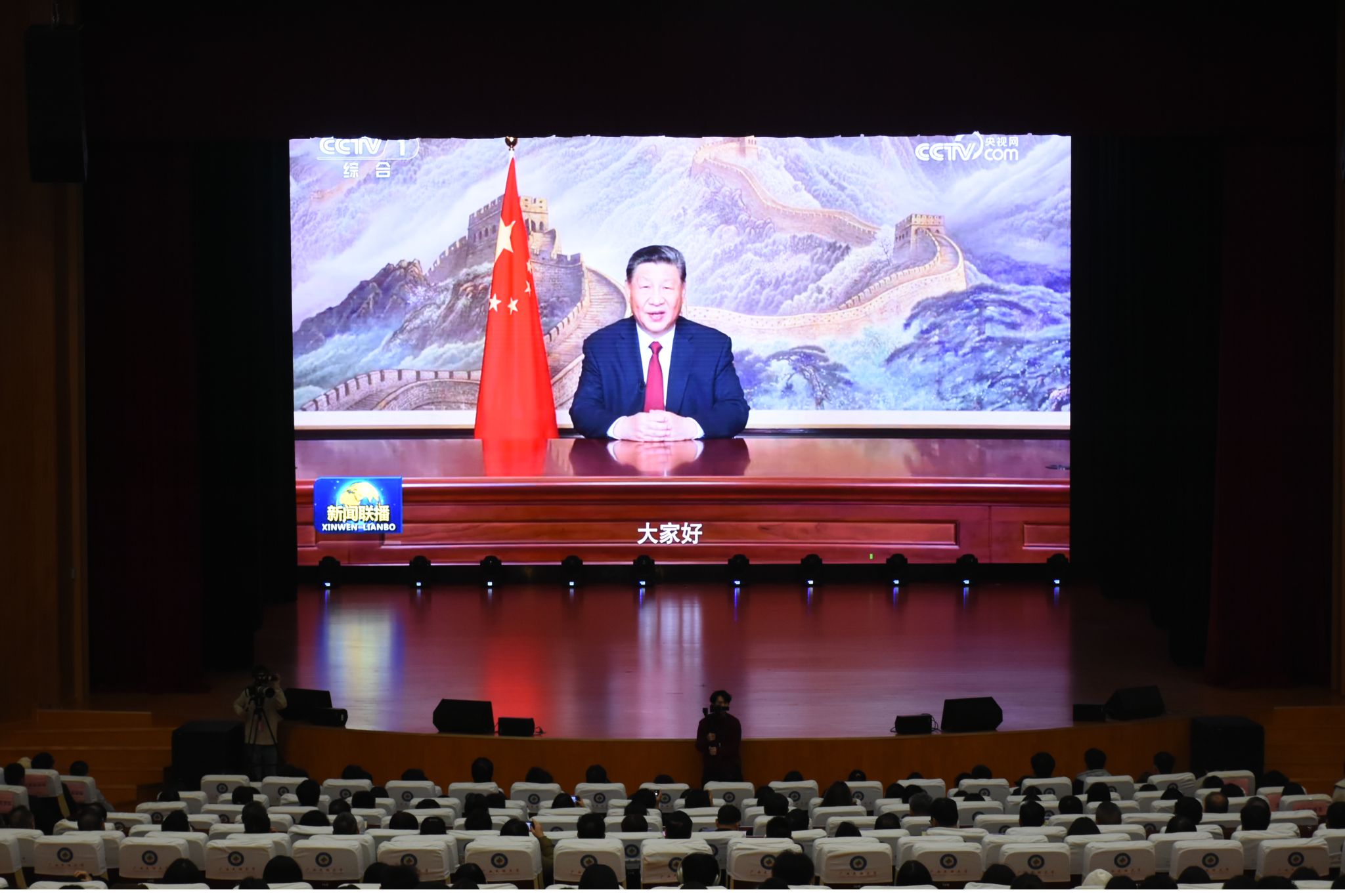 【大学生通讯社报道】国家主席习近平于今晚7时通过中央广播电视总台和互联网,发表二〇二五年新年贺词。beat365英国官方网站校领导和各族师生代表在思源湖校区大学生活动中心礼堂集中收看直播。