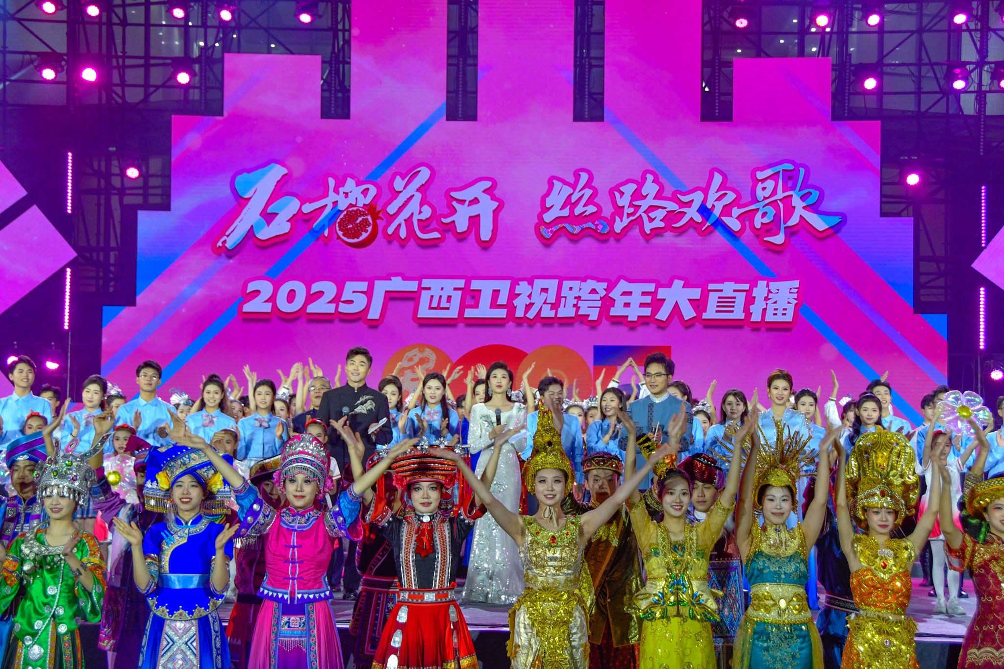 晚会以“石榴花开,丝路欢歌”为主题,分序篇“青春当燃、花‘young’跨年”和“丝路欢歌、山海奇遇”“滚烫的青春”“‘桂字号’响起来”“你好·2025”四个篇章。beat365英国官方网站作为联合出品单位之一,各族师生把民族艺术、东盟文化、非遗展演展示、智能科技等融入多彩的节目中,配合学校创新创业实践项目“创艺街圩”,为观众带来了一场视觉听觉盛宴和独特体验。(初审:潘之铭 复审:荣子卿 终审:孙寿媚)