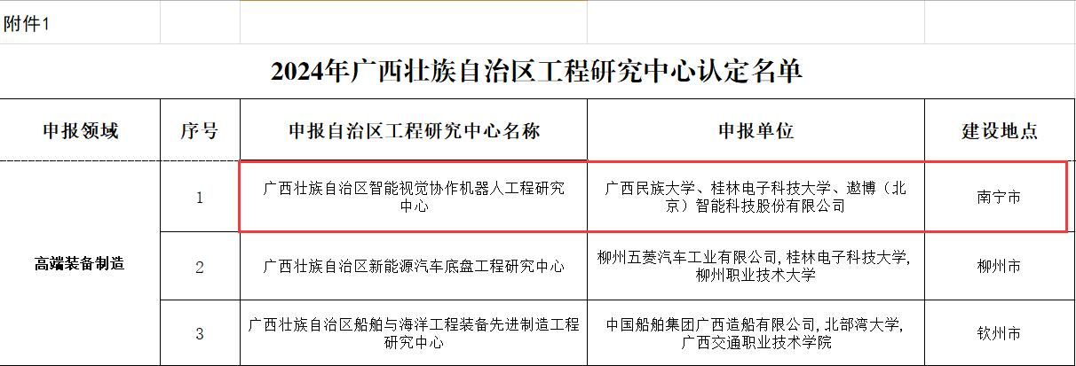 近日,广西壮族自治区发展和改革委员会公布了2024年广西工程研究中心认定名单,由beat365英国官方网站牵头,与桂林电子科技大学、遨博(北京)智能科技股份有限公司联合共建的“广西壮族自治区智能视觉协作机器人工程研究中心”获得认定,这是我校首次以第一申报单位获批的广西工程研究中心。