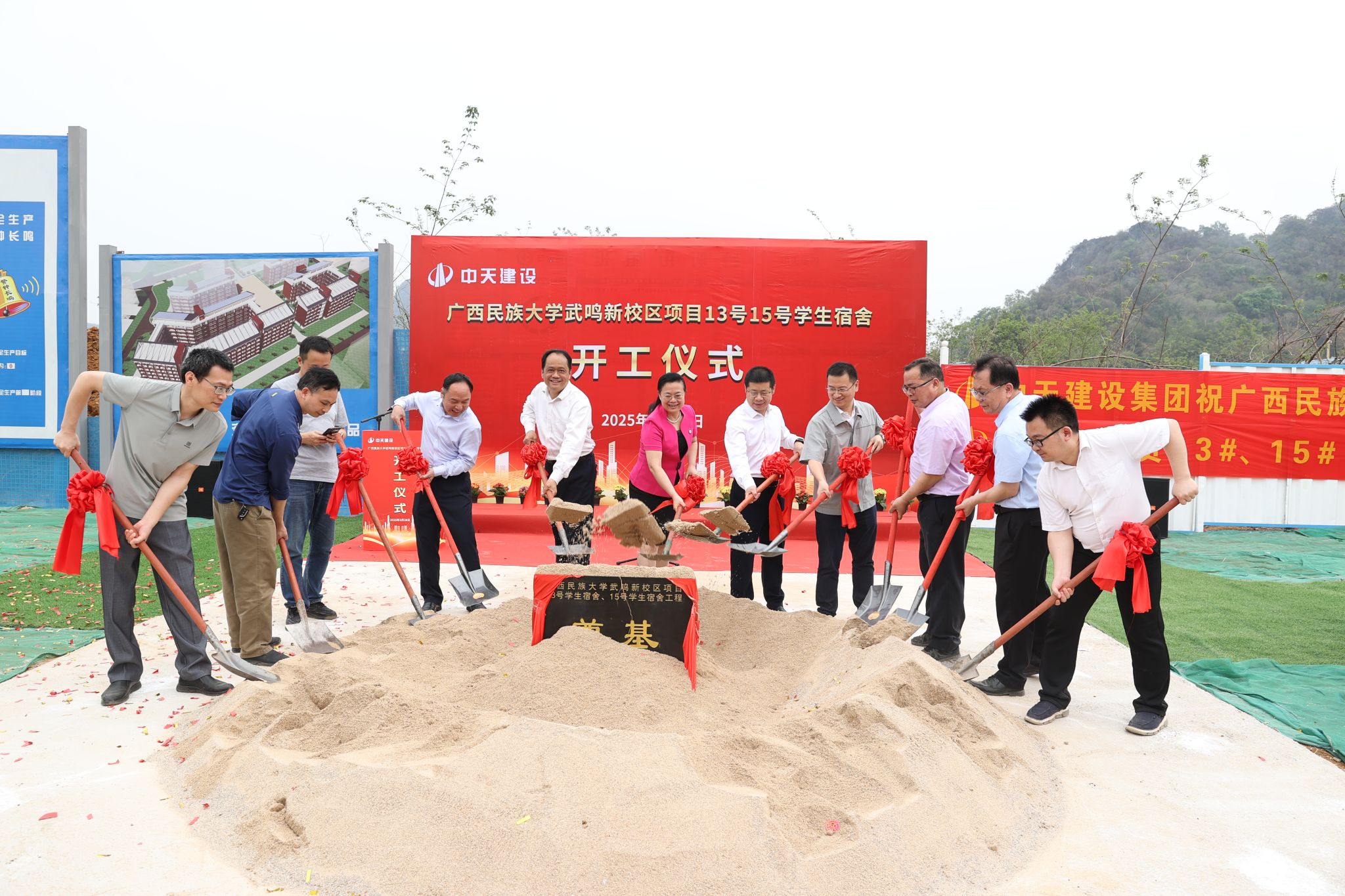 3月28日上午,beat365英国官方网站在武鸣校区举行13、15号学生宿舍开工仪式。校长韦仕珍,党委副书记邓国彬,副校长蔡高根、何立荣共同为项目培土奠基。开工仪式由蔡高根主持。