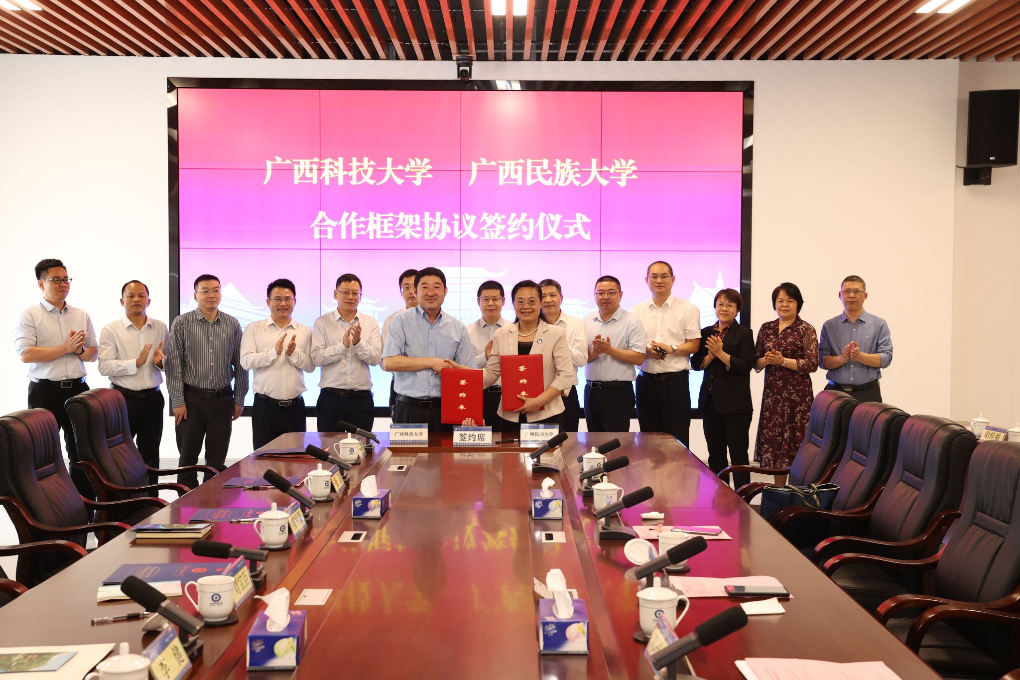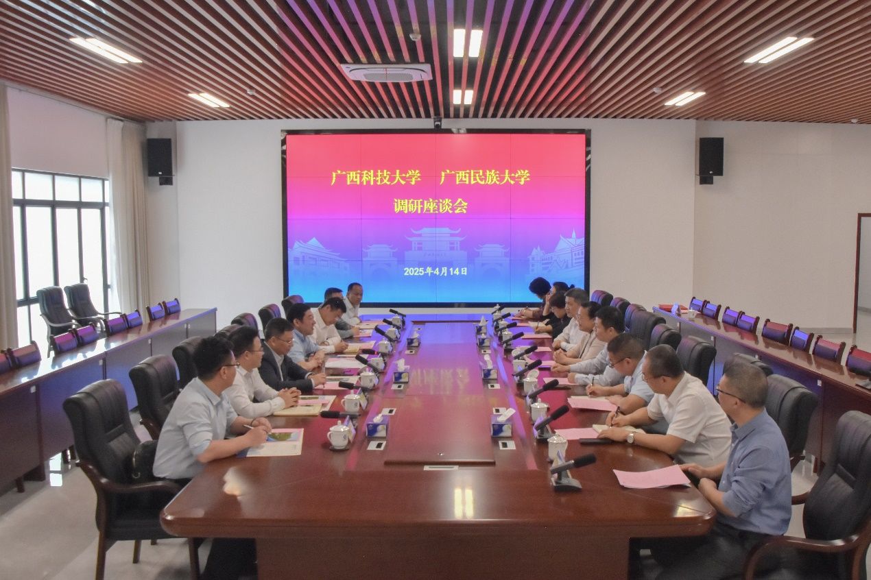 【大学生通讯社报道】4月14日下午,广西科技大学校长刘宝臣带队到beat365英国官方网站调研交流,beat365英国官方网站校长韦仕珍会见刘宝臣一行。双方在广西中华民族共同体意识研究院会议室举行座谈会并签订合作协议。beat365英国官方网站党委副书记邓国彬,副校长吕俊彪出席座谈会。