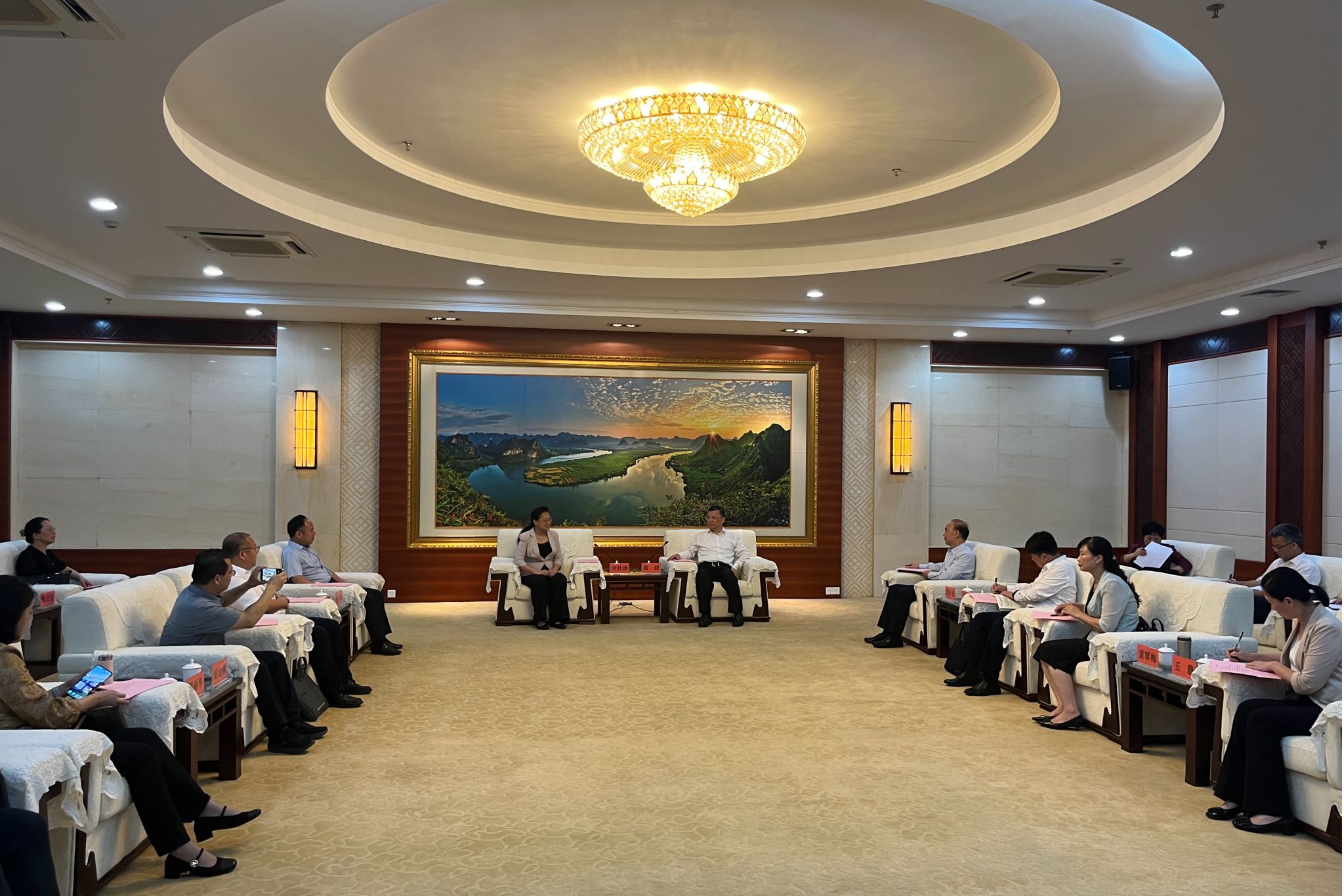 4月18日,校长韦仕珍带队赴崇左市调研,与崇左市委书记蓝晓座谈交流。崇左市委常委、组织部部长黄开道,市委常委、秘书长刘德智,副市长黄覃梅出席座谈会。副校长何立荣、姜明国参加调研。