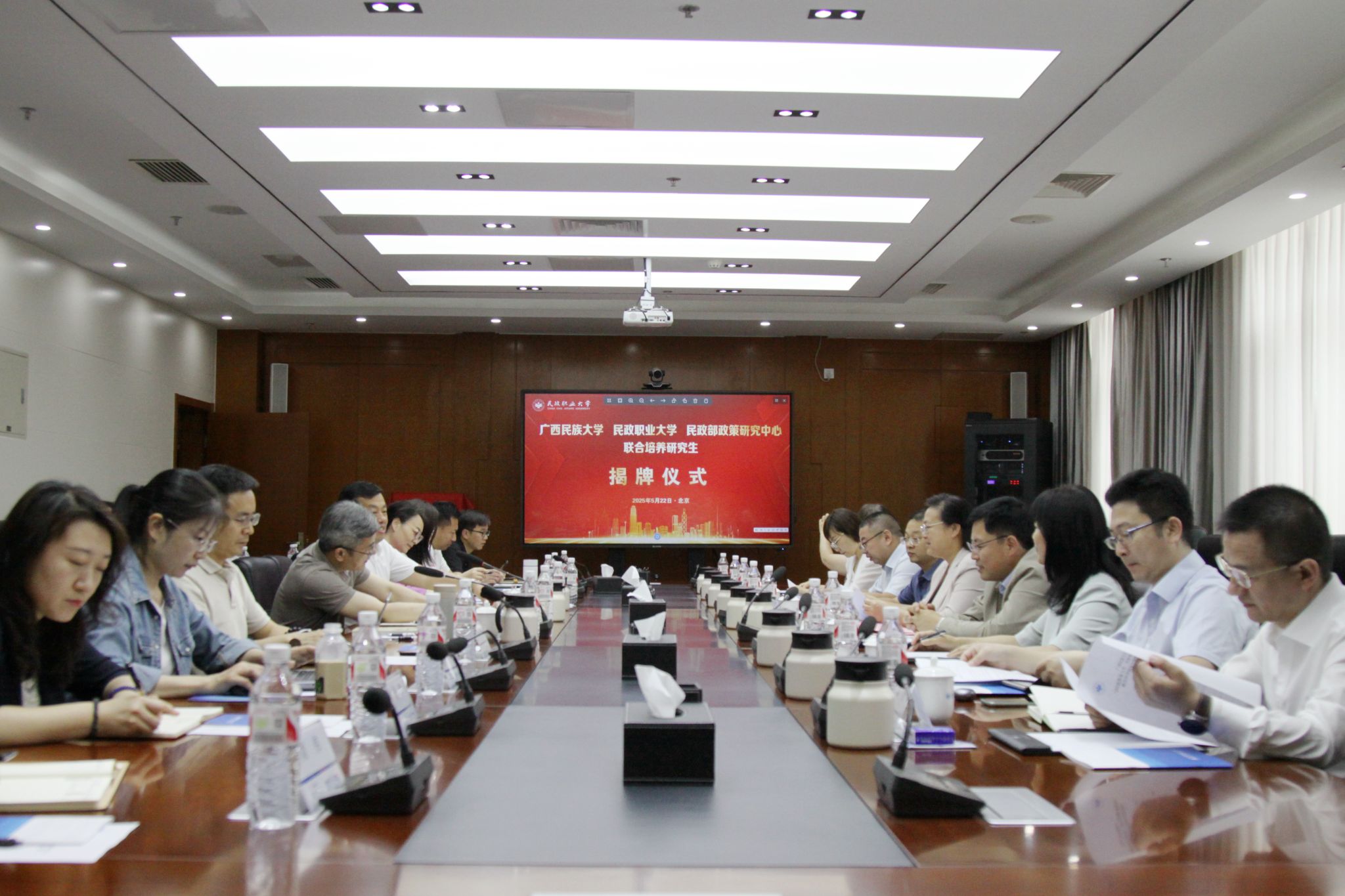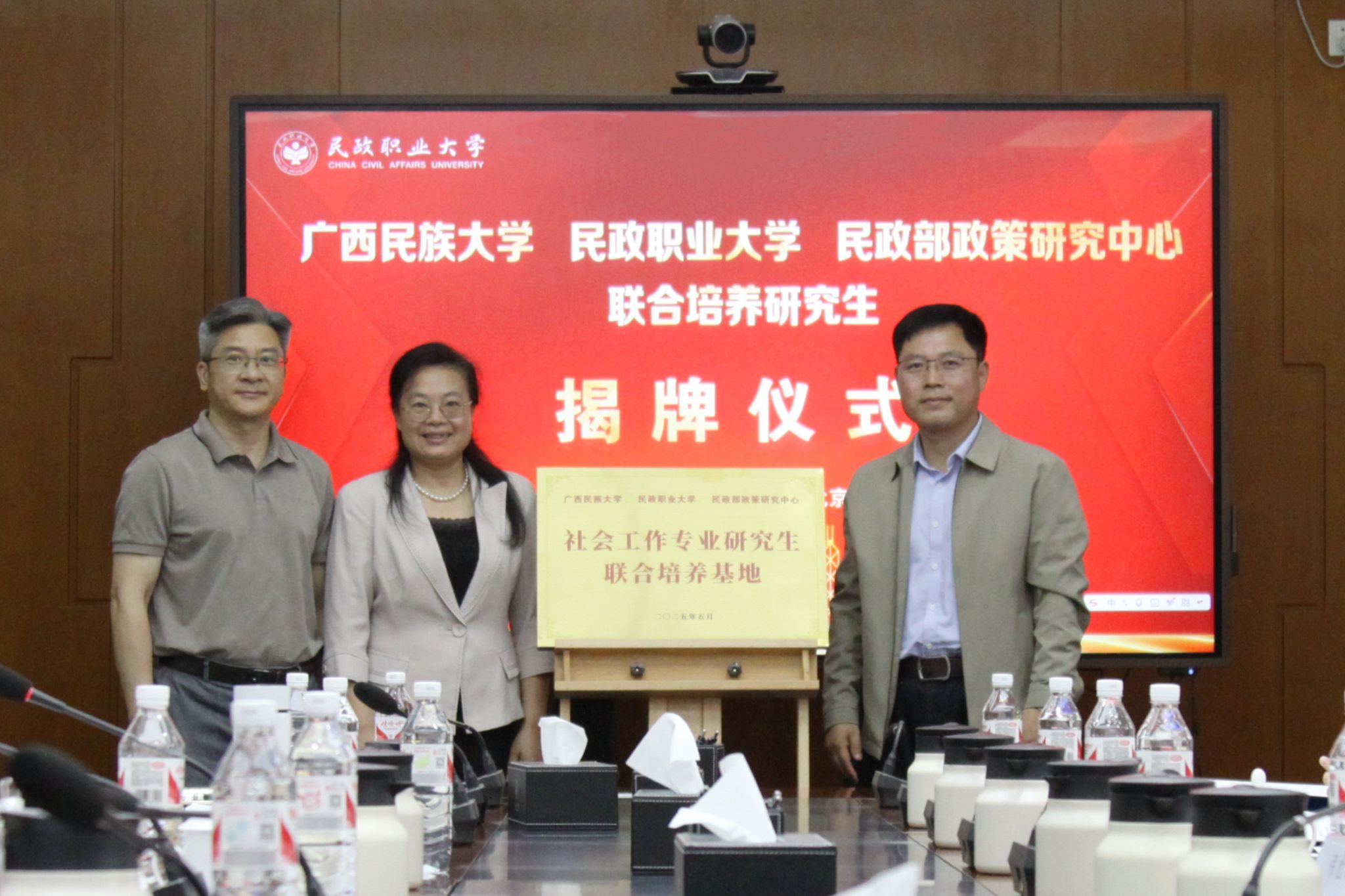5月22日,beat365英国官方网站、民政职业大学、民政部政策研究中心共建“社会工作专业研究生联合培养基地”揭牌仪式在民政职业大学综合楼举行。beat365英国官方网站校长韦仕珍,民政职业大学校长李绚,民政部政策研究中心综合研究室主任侯新毅出席会议并分别致辞。