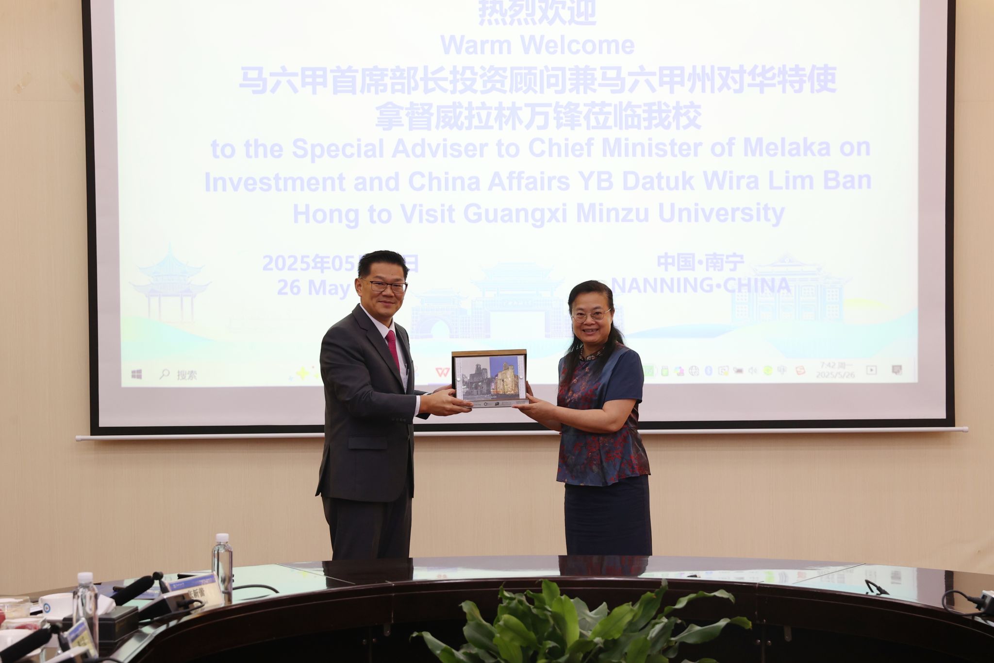 韦仕珍对林万锋一行的到来表示欢迎。她表示,学校始终坚持搭建国际化交流平台,积极推动与东盟国家高校的合作,希望以本次交流为契机,持续深化学校与马六甲州在学生联合培养、学术资源共享、科研项目协作等领域合作,为区域发展与国际教育交流注入新动能。