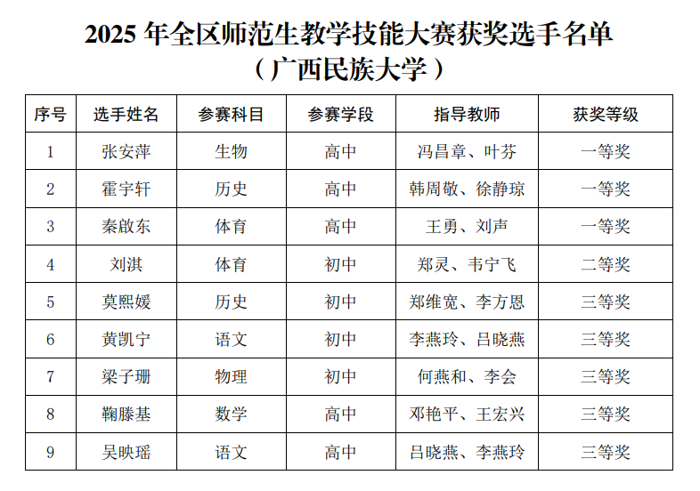 近日,自治区教育厅公布2025年全区师范生教学技能大赛获奖名单,beat365英国官方网站共获一等奖3项,二等奖1项,三等奖5项。一等奖获奖数量为全区非师范类高校之最,创造了我校参加该项赛事以来的最好成绩。