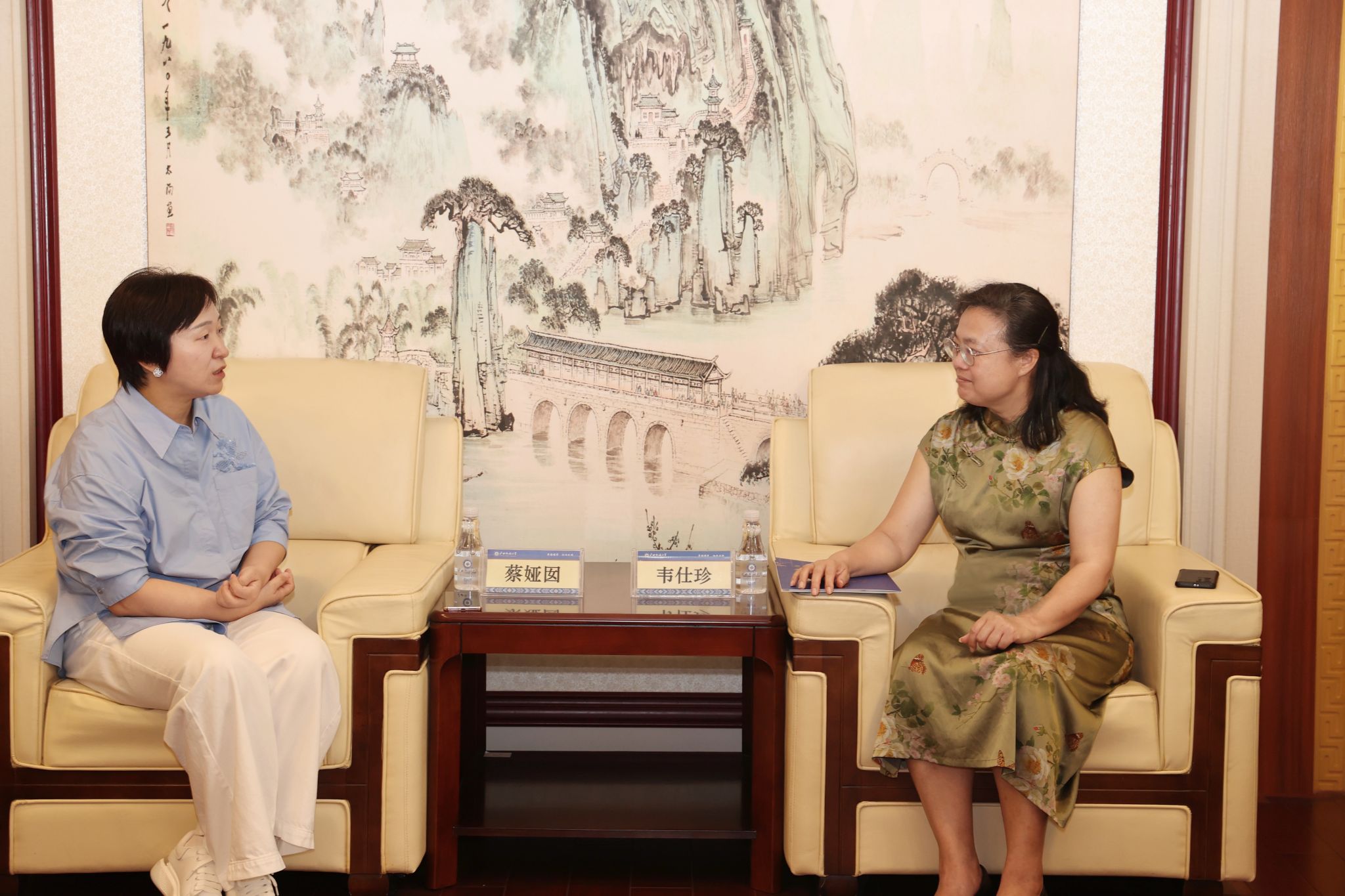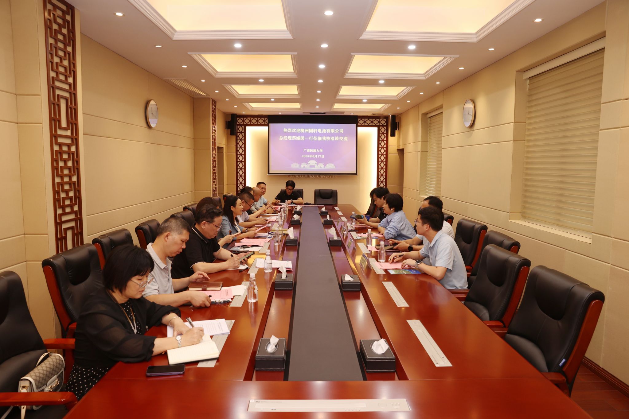 6月17日上午,柳州国轩电池有限公司总经理蔡娅囡一行到beat365英国官方网站交流,校长韦仕珍在座谈会前会见蔡娅囡一行。国际合作与交流处(国际教育学院)、教务处、财务处、研究生院、校友联络办等部门负责人参加座谈会。