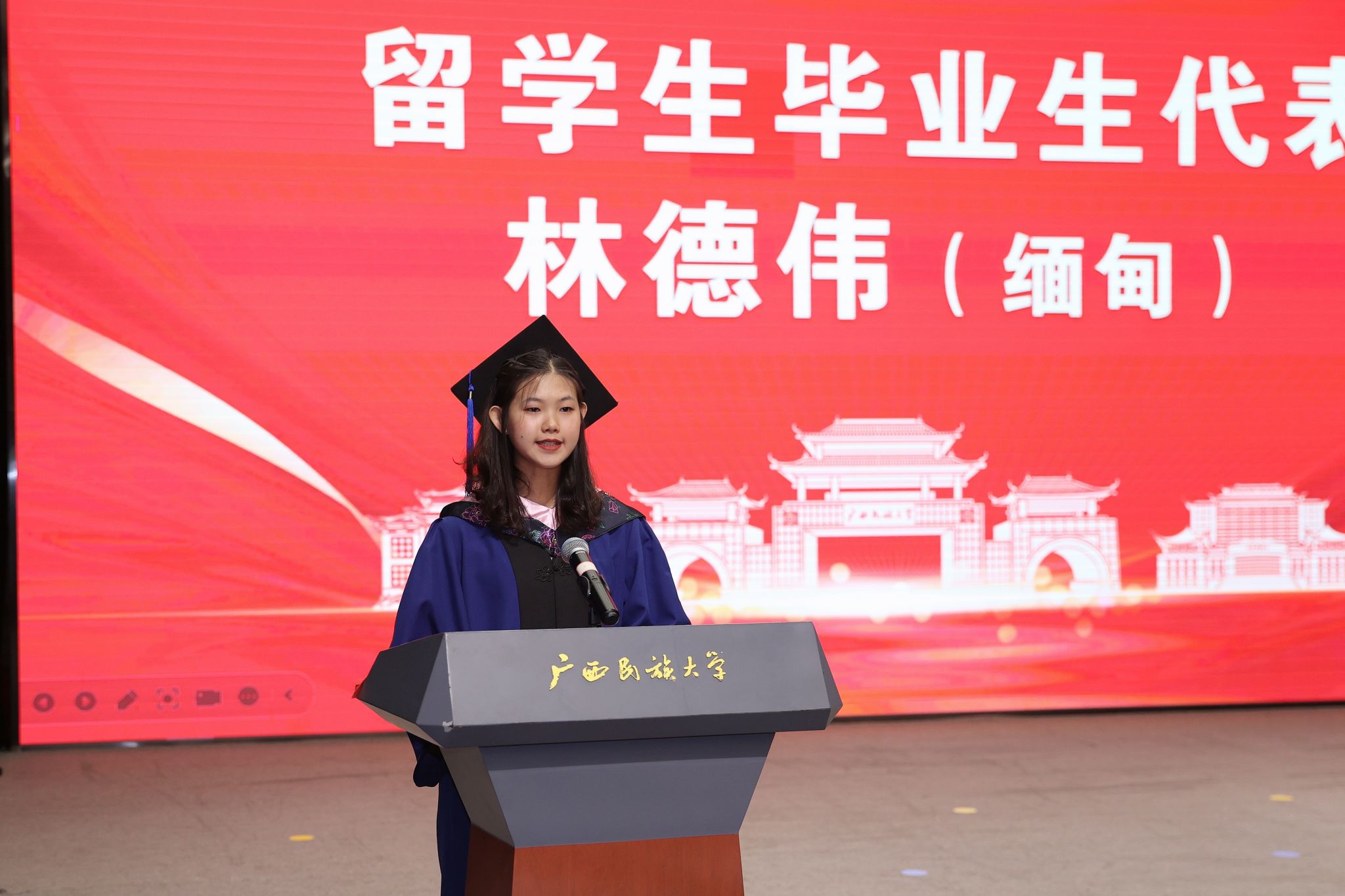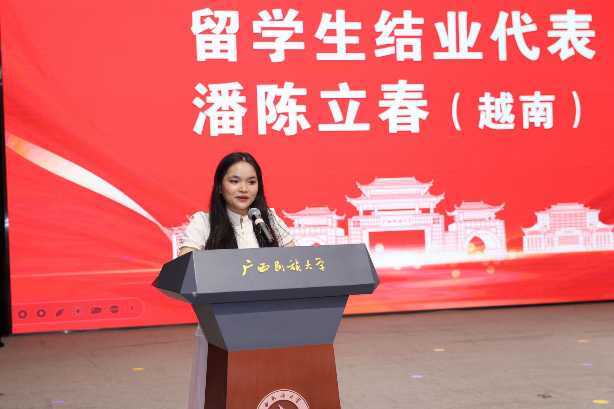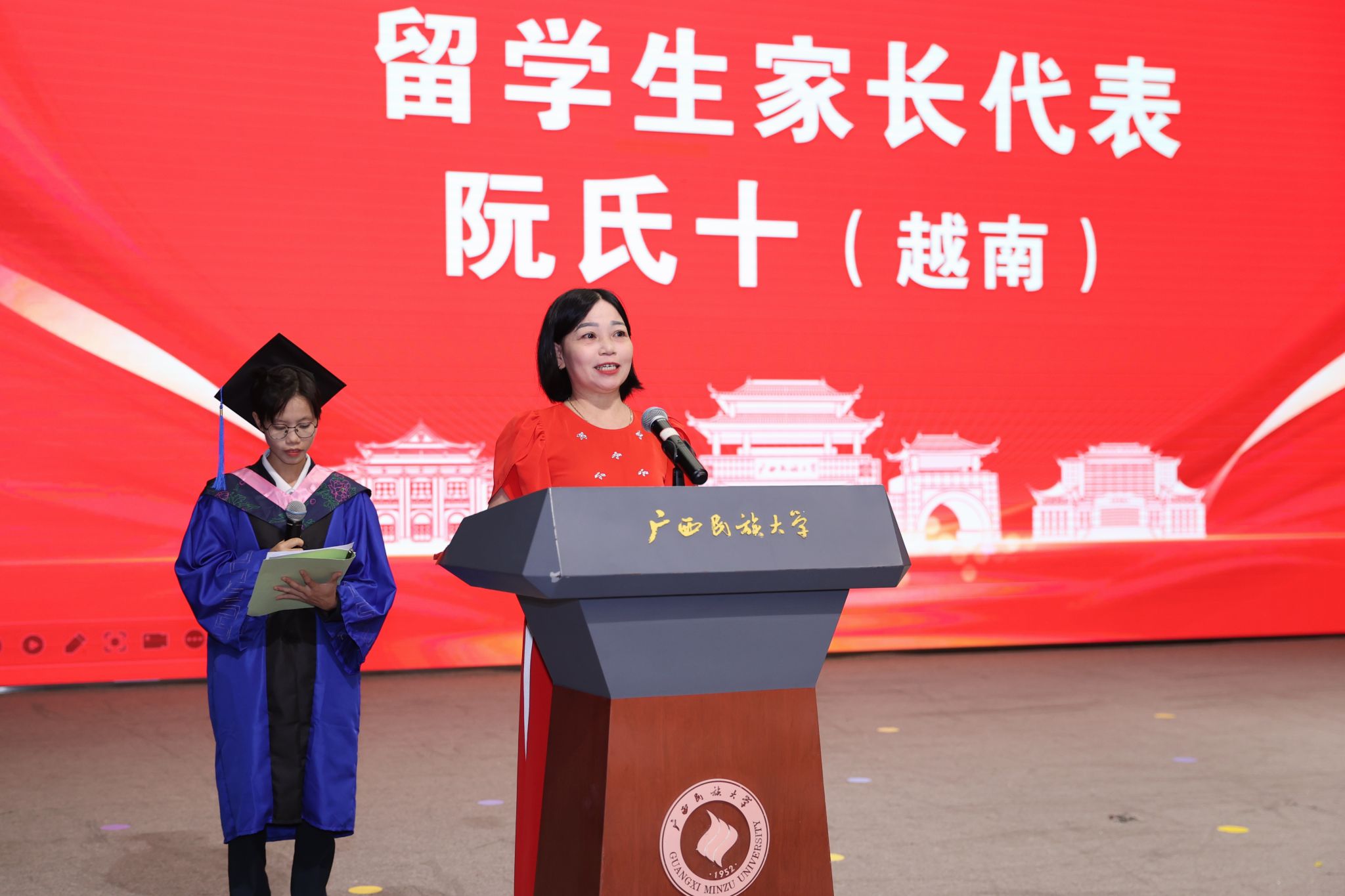 毕业典礼上,教师代表龙朋、越南籍毕业生家长代表阮氏十、缅甸籍毕业生代表林德伟、越南籍留学生结业代表潘陈立春分别发言,分享自己的感受与收获。