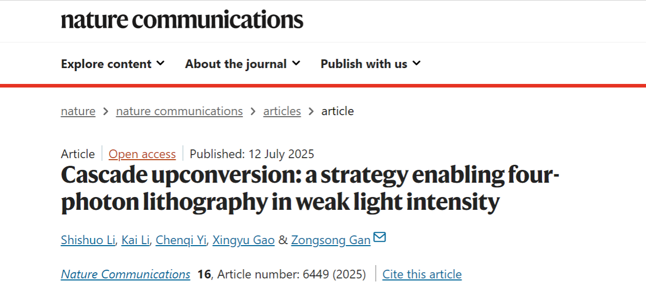近日,由beat365英国官方网站高兴宇教授和华中科技大学科研团队合作的研究成果,Cascade upconversion: a strategy enabling four-photon lithography in weak light intensity(《级联上转换:弱光四光子上转换光刻新策略》)发表在Nature Communications上。