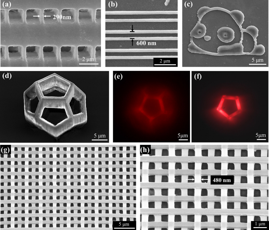 实验结果表明,该策略在10⁵ W/cm²的低激光强度下,成功实现了最小特征尺寸为290 nm的三维聚合物结构打印,分辨率较传统UCPP提升两个数量级。此外,级联上转换策略克服了UCNPs发光扩散的问题,同时保留了近红外光穿透深度高、材料损伤小的优势。