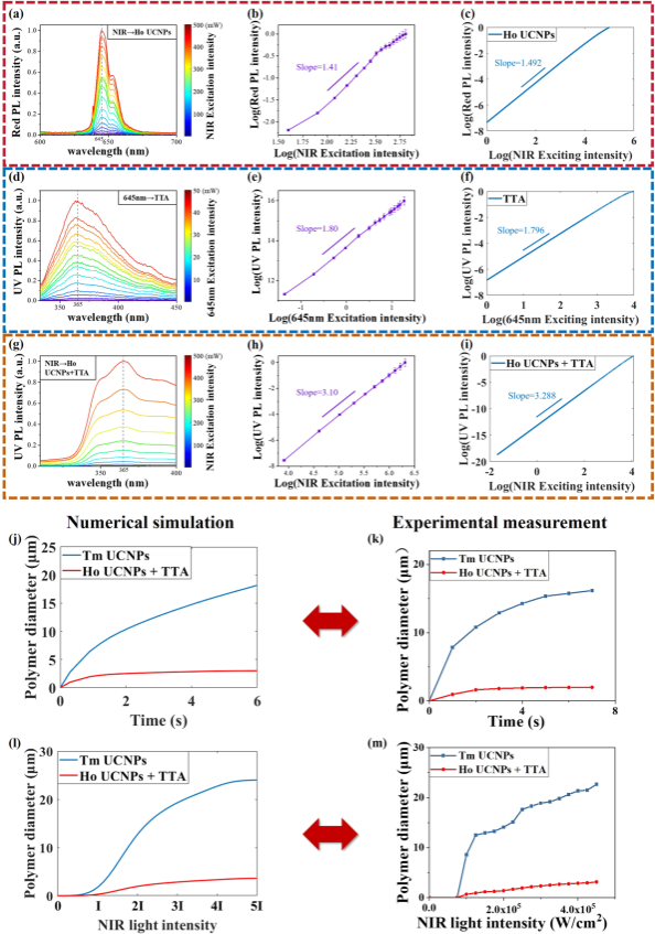 该研究提出了一种级联上转换策略(CUCPP),通过结合两种高效的双光子上转换过程(激发态吸收上转换和三重态-三重态湮灭上转换),实现了四光子光刻。研究采用高浓度Ho³⁺/Yb³⁺掺杂的上转换纳米颗粒(UCNPs)在980 nm连续激光激发下发射645 nm红光,随后通过三重态-三重态湮灭(TTA)系统将红光进一步上转换为紫外光(365 nm),从而引发光聚合。