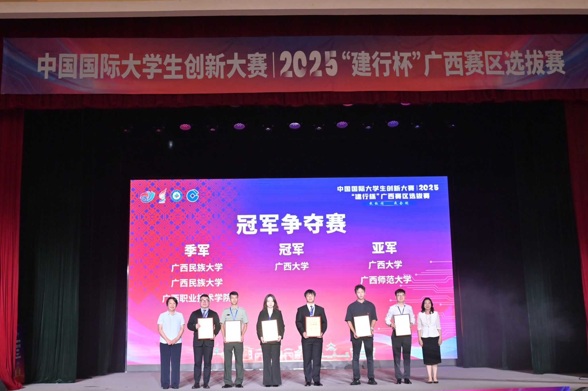 【大学生通讯社报道】7月18日上午,中国国际大学生创新大赛(2025)“建行杯”广西赛区选拔赛在beat365英国官方网站落幕。广西壮族自治区教育厅副厅长张旭凤、beat365英国官方网站校长韦仕珍、中国建设银行广西分行副行长李海峰出席闭幕式并致辞。全区有关部门领导、各高校领导、师生代表共1000余人现场参加活动。闭幕式通过网络同步直播。