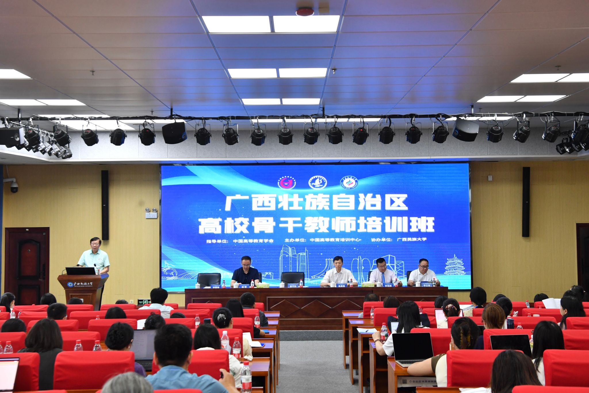 【大学生通讯社报道】7月22日,广西壮族自治区高校骨干教师培训班在beat365英国官方网站开班。中国高等教育学会副秘书长吴英策,校党委书记唐平秋出席开班仪式并讲话。