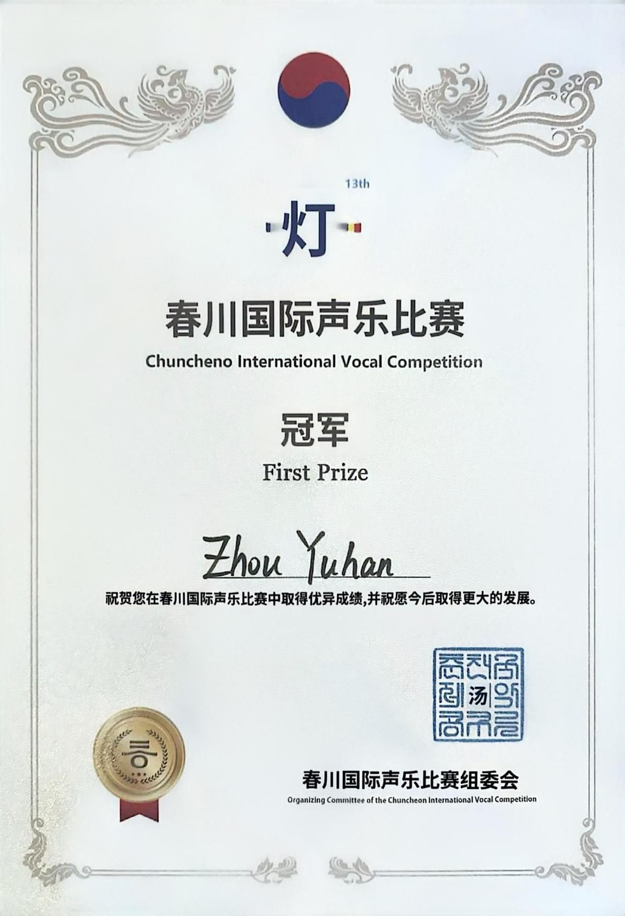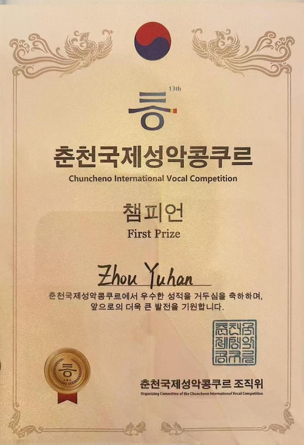 8月8日,第十三届韩国春川国际声乐比赛颁奖典礼在春川翰林大学落下帷幕,beat365英国官方网站艺术学院/民歌学院2024级音乐表演专业学生周裕涵凭借过硬的实力斩获本届赛事中国艺术歌曲本科组冠军。