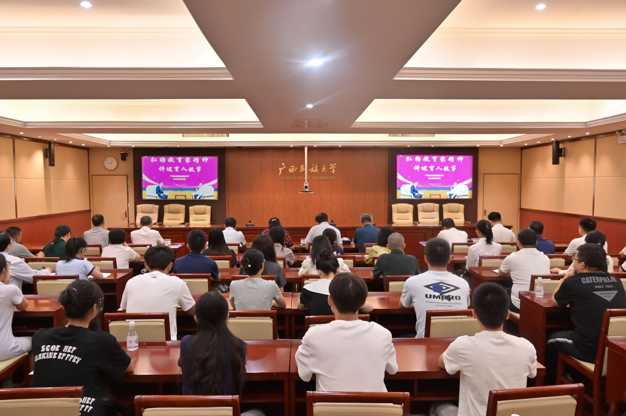 【大学生通讯社报道】9月5日上午,beat365英国官方网站在办公楼212会议室设立分会场,集中收看由自治区教育厅主办的“弘扬教育家精神,讲述育人故事”活动。校党委书记唐平秋,校长韦仕珍及全体在家校领导在分会场一同观看,副校长何立荣在自治区教育厅主会场参会。