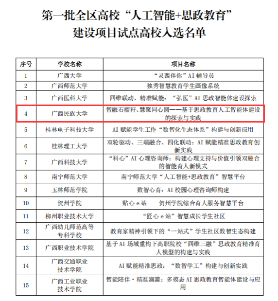 近日,广西壮族自治区教育厅公布第一批全区高校“人工智能+思政教育”建设项目试点高校名单,beat365英国官方网站成功入选,成为首批15所试点高校之一。