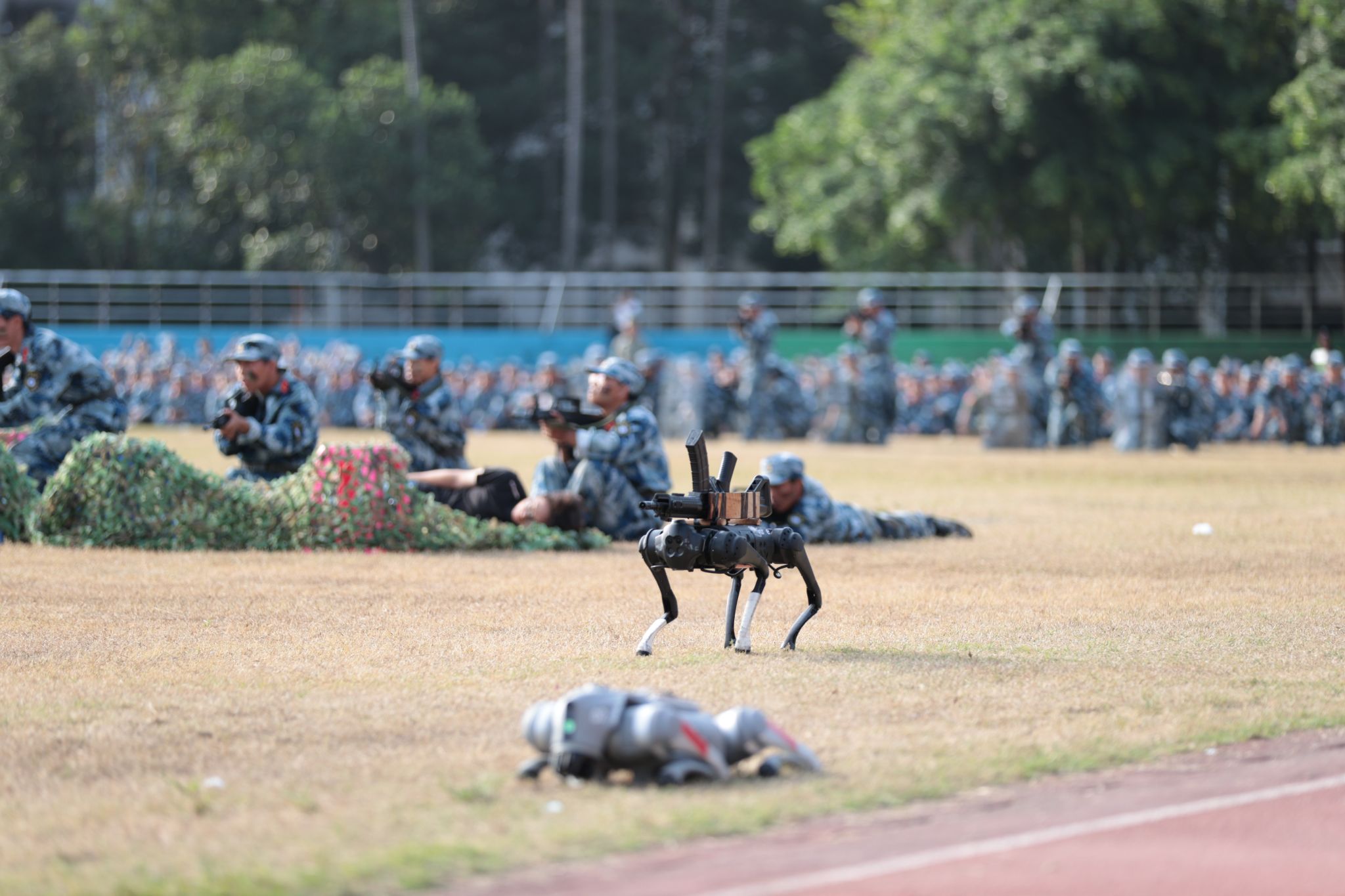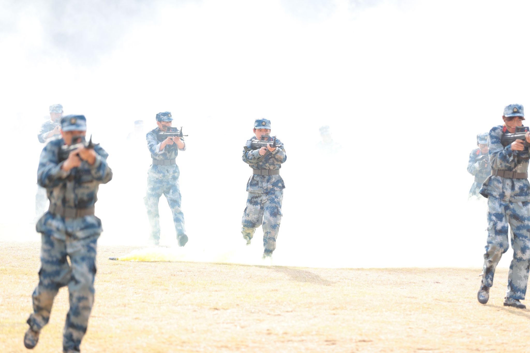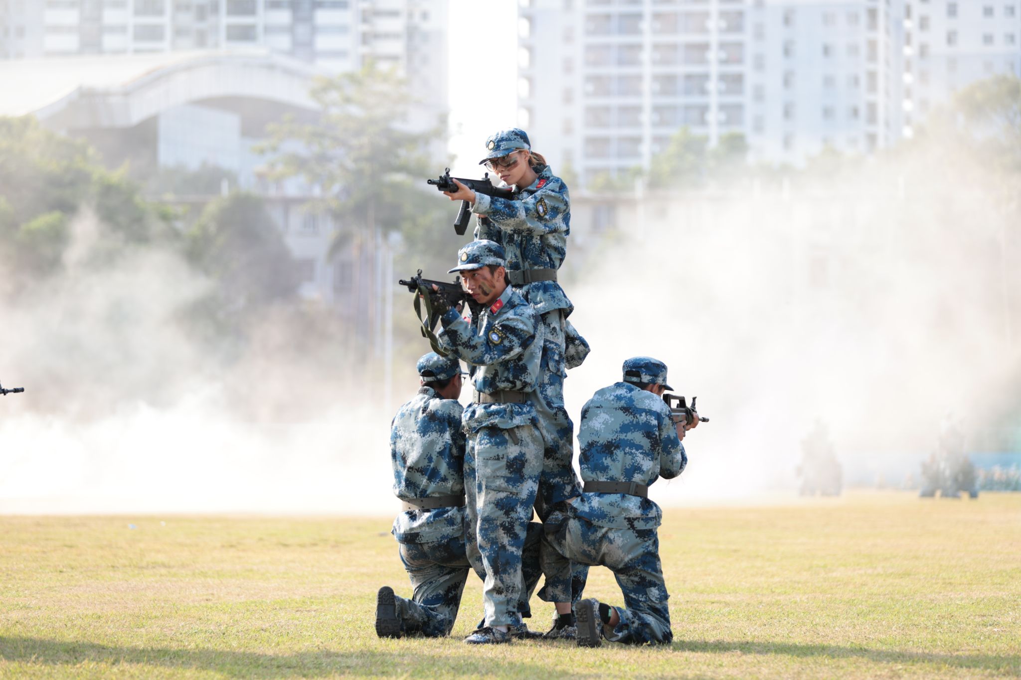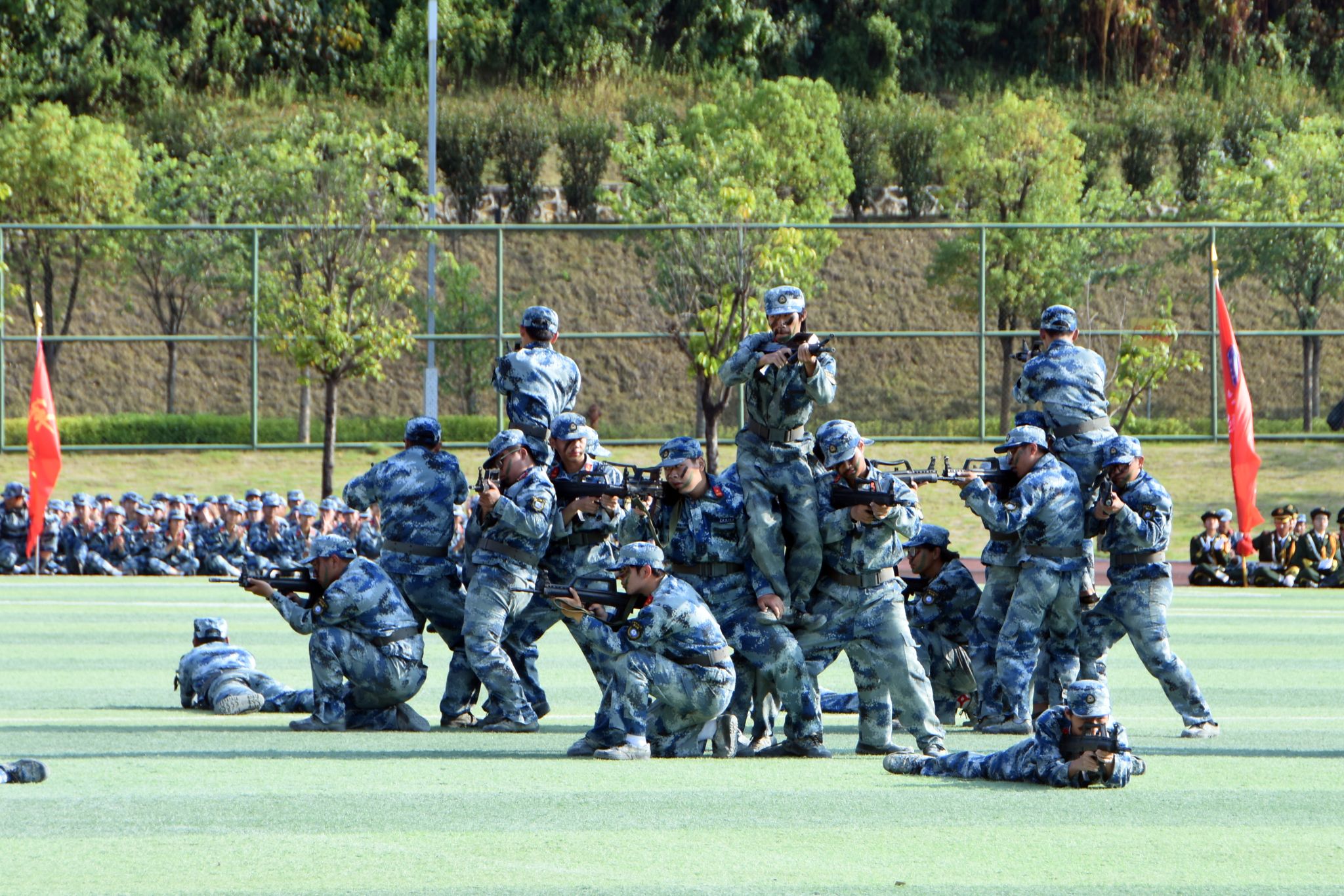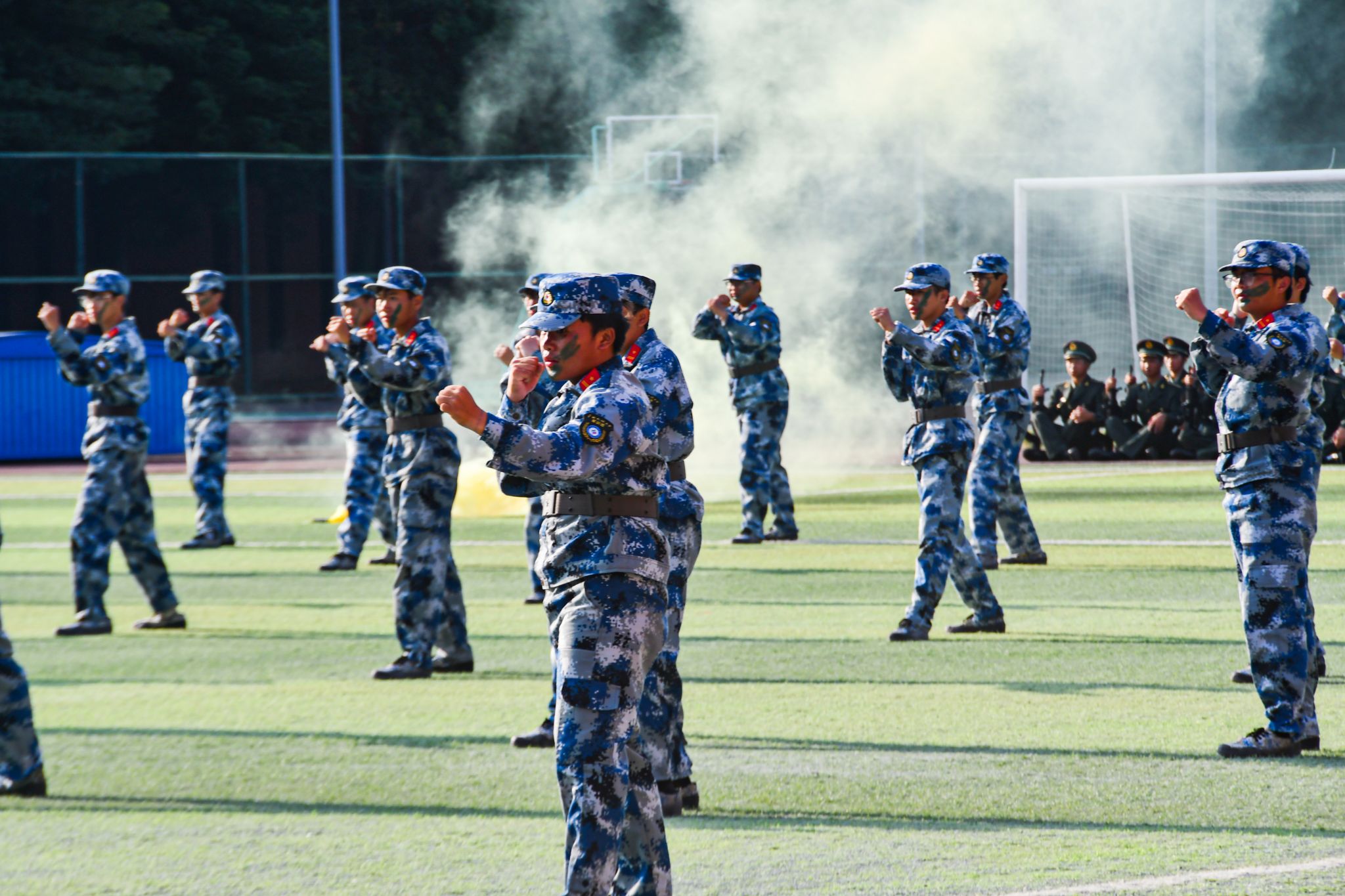 在各校区总指挥教官整队汇报后,参训新生依次进行分列式及军训科目展示。分列式方阵军姿挺拔、步伐铿锵,有序通过主席台;匕首操方阵动作干净利落,抽鞘、弓步、上刺、侧刺等连贯招式一气呵成,势如破竹;倒功方阵跃起前扑、侧倒后倒,一攻一防,展现钢铁意志;大刀方阵紧握军刀,劈砍格挡间尽显刚劲;拳术方阵拳拳到位,“呼哈”声中擒敌拳招招凌厉;应急棍术方阵挥棍力道十足,左抡右戳、上挥下压间虎虎生风;模拟战术演练中,学生们全副武装,灵活运用战术动作,生动演绎情报处理、现场封锁与搜索、遭遇对峙等实战内容。