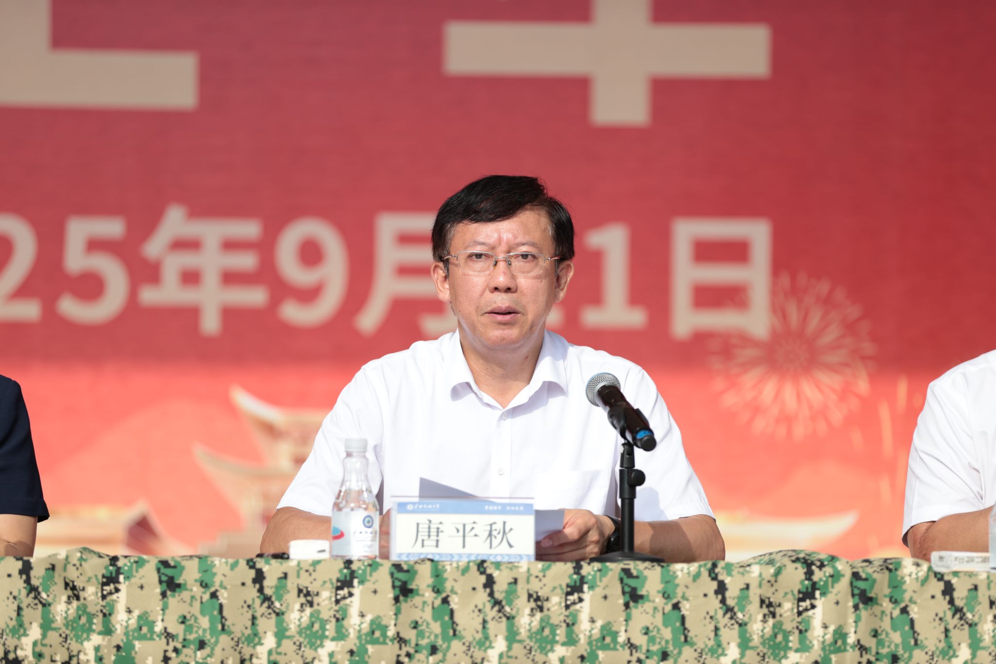 唐平秋对本次军训成果予以充分肯定,向圆满完成军训任务的同学们表示祝贺,对承训教官和参训干部表示感谢。他强调,军训作为大学第一课,不仅锤炼体魄,更磨炼意志。希望同学们一要以“站军姿”的定力锚定目标,将个人理想融入党和国家事业之中;二要以“练队列”的协作深耕学习,提升个人专业能力,培养团队协作素养;三是以“整内务”的规范涵养品德,在规范中培养责任感,争做有理想、敢担当、能吃苦、肯奋斗的新时代好青年。
