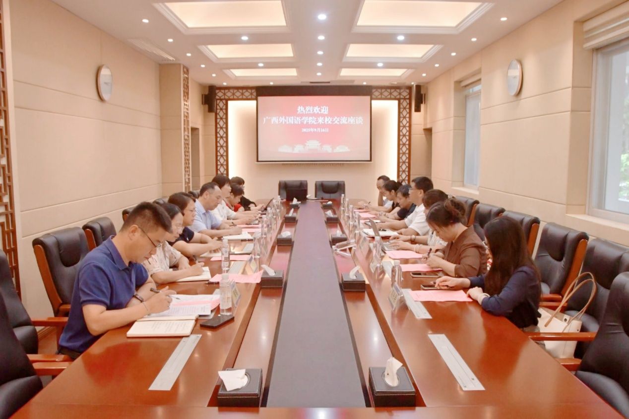 9月16日,校党委常委、副校长何立荣会见广西外国语学院副校长马剑平一行。双方就对口支援工作、学科共建、师资培育、资源互通、经验交流等方面展开座谈交流。(初审/陈媛 图文/卢思然 黄茵茵 编/黎倩雅 复审/李建瑾 终审/孙寿媚)