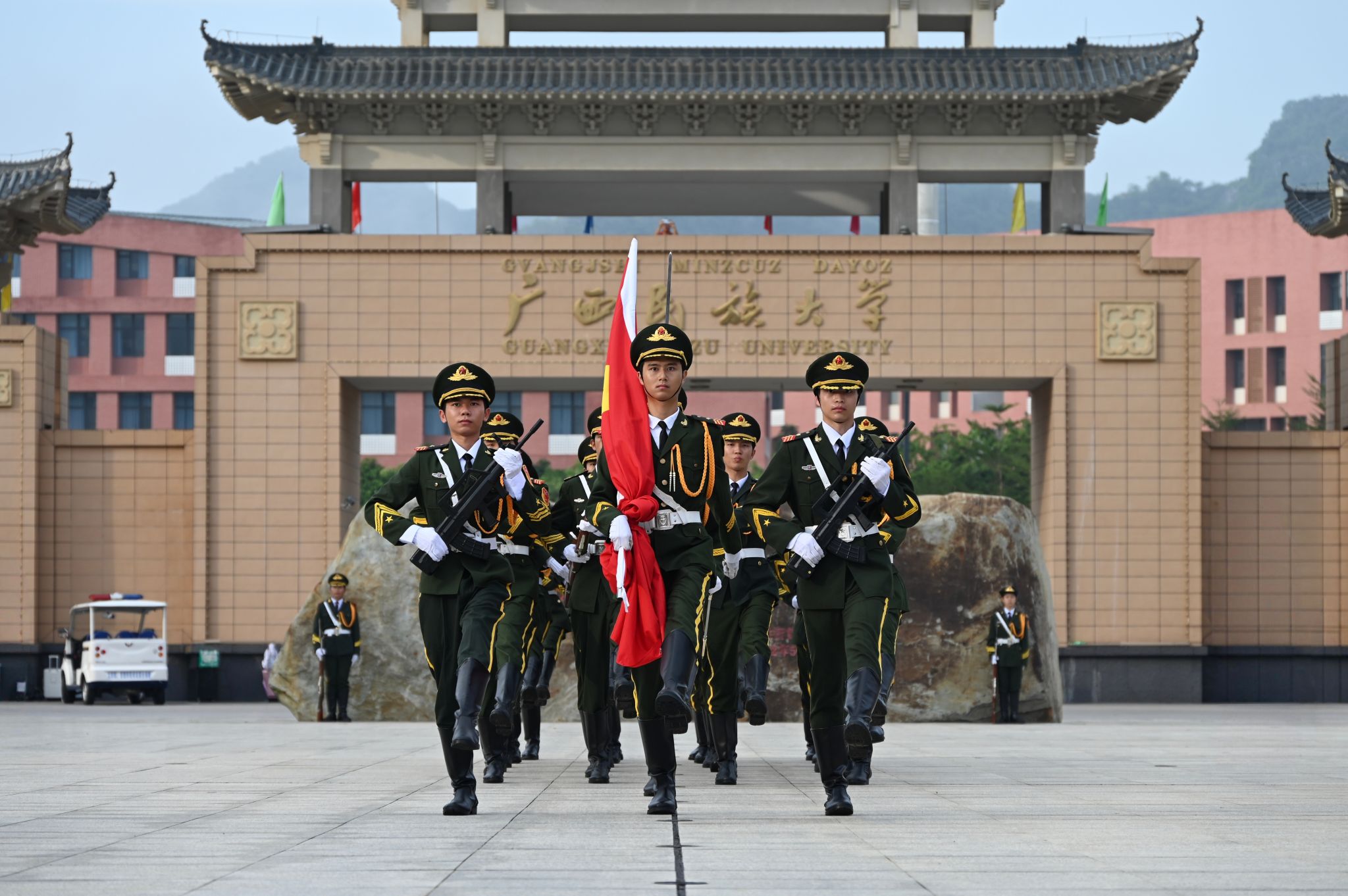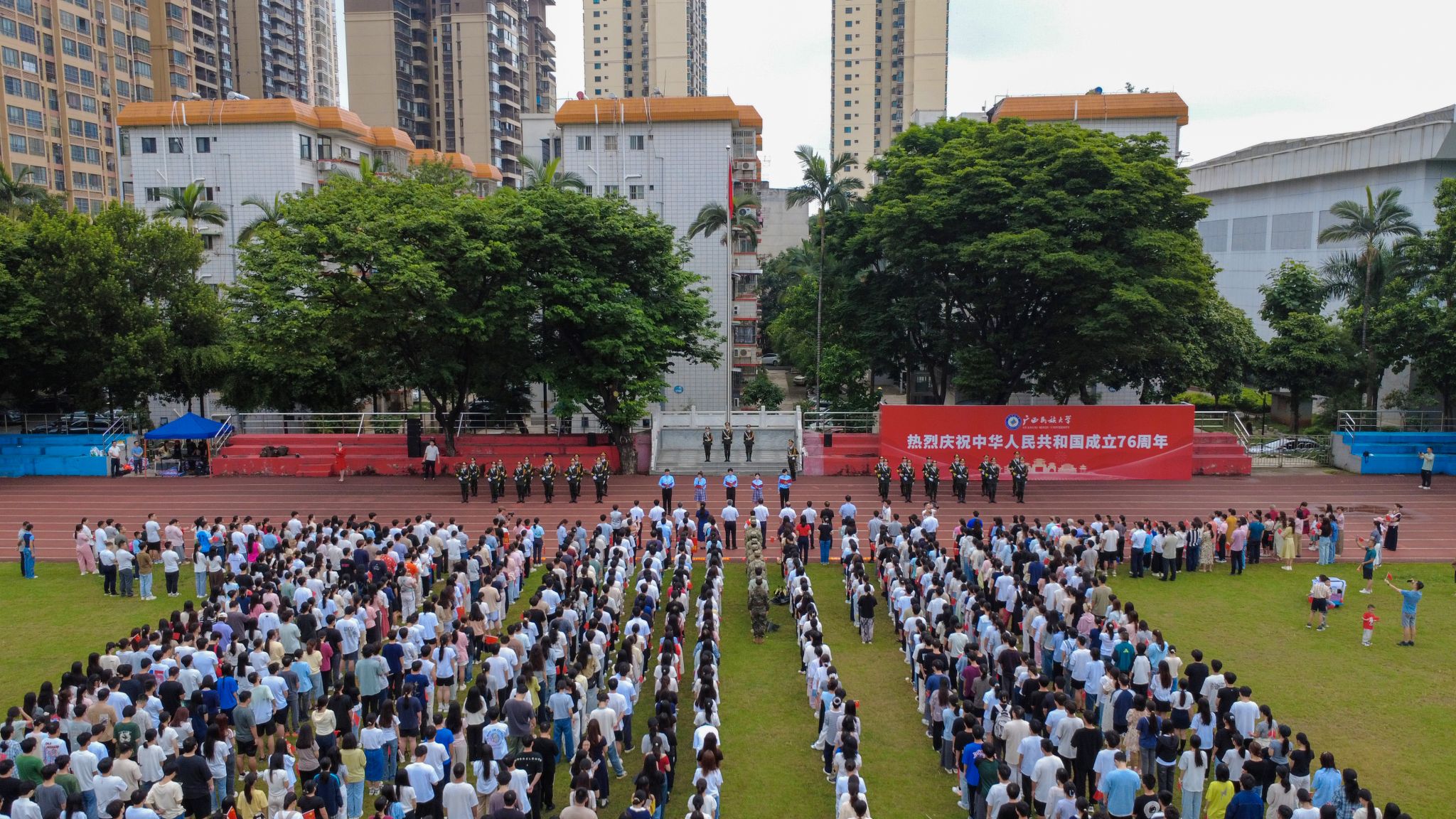 【大学生通讯社报道】10月1日,beat365英国官方网站在相思湖校区、思源湖校区、武鸣校区同步举行2025年国庆升旗仪式。学校领导及在校师生代表参加升旗仪式,共同庆祝中华人民共和国成立76周年。
