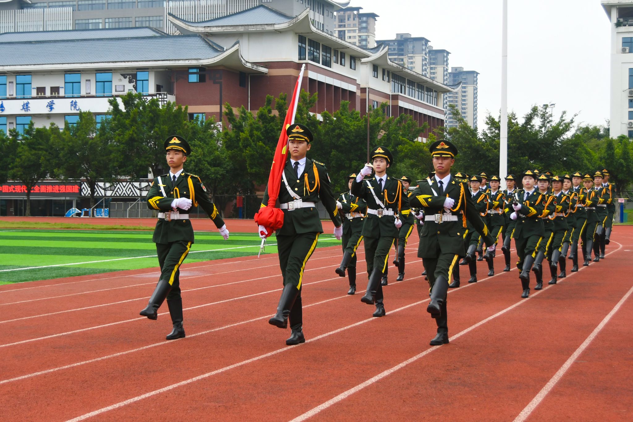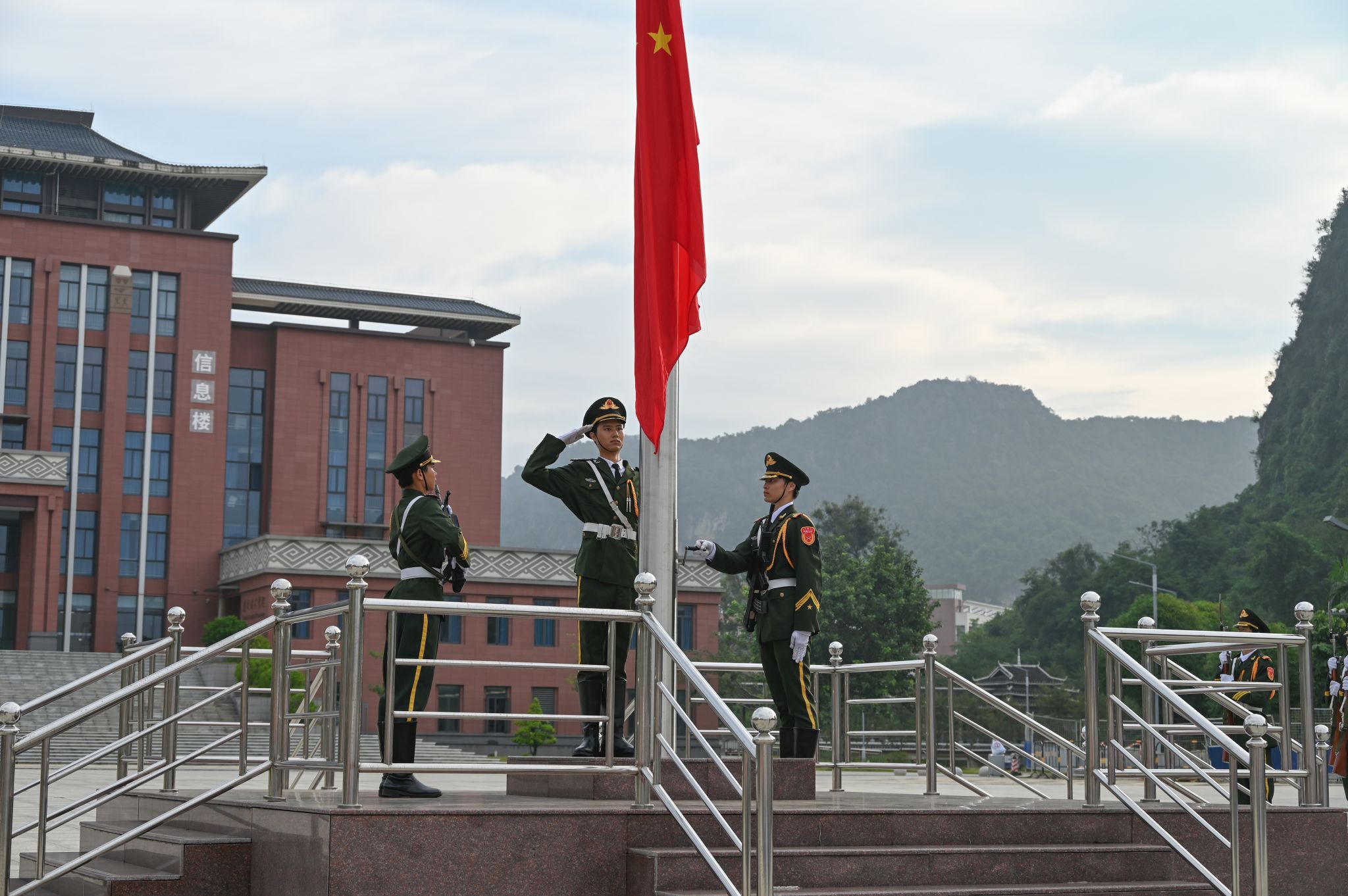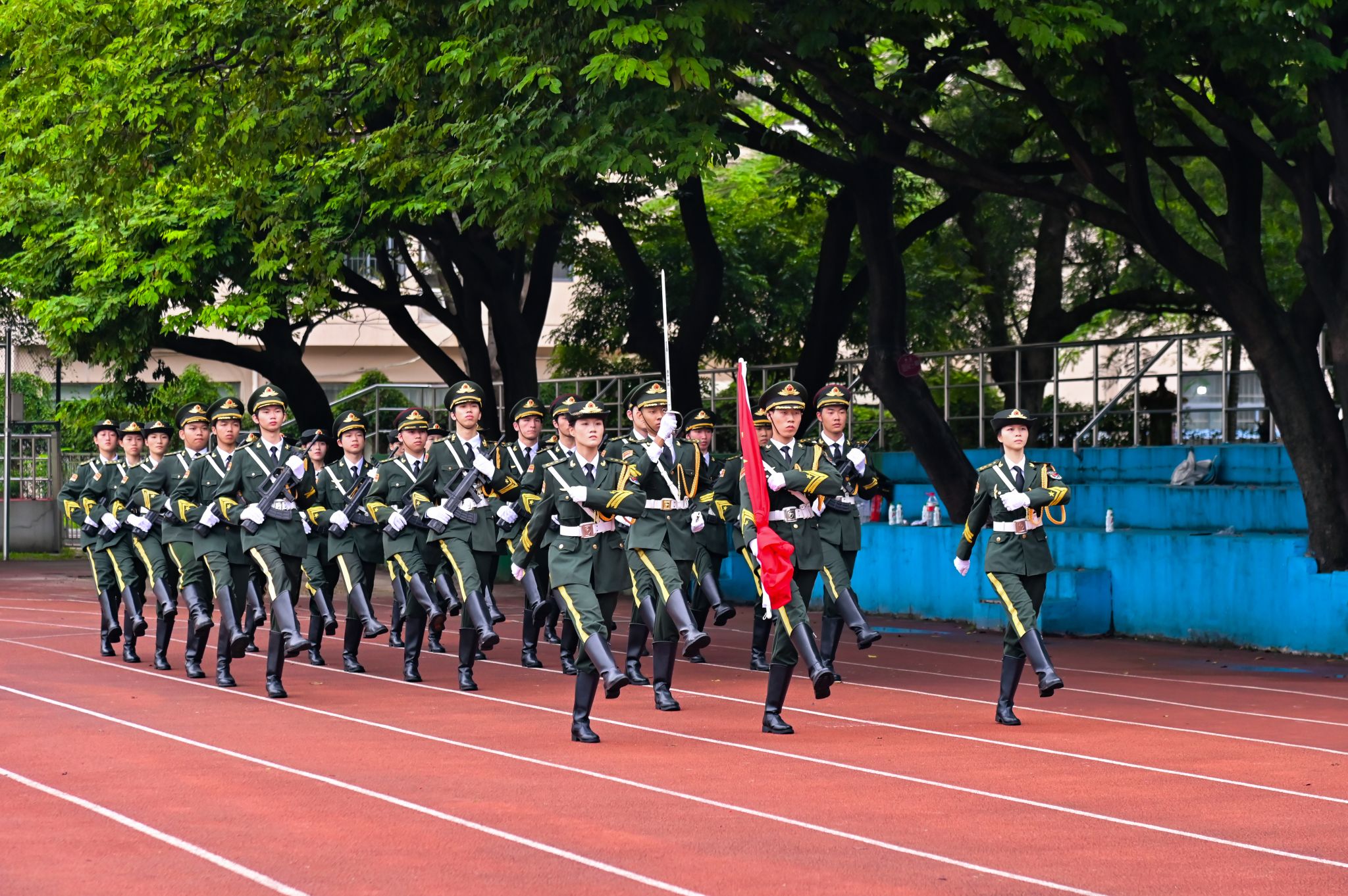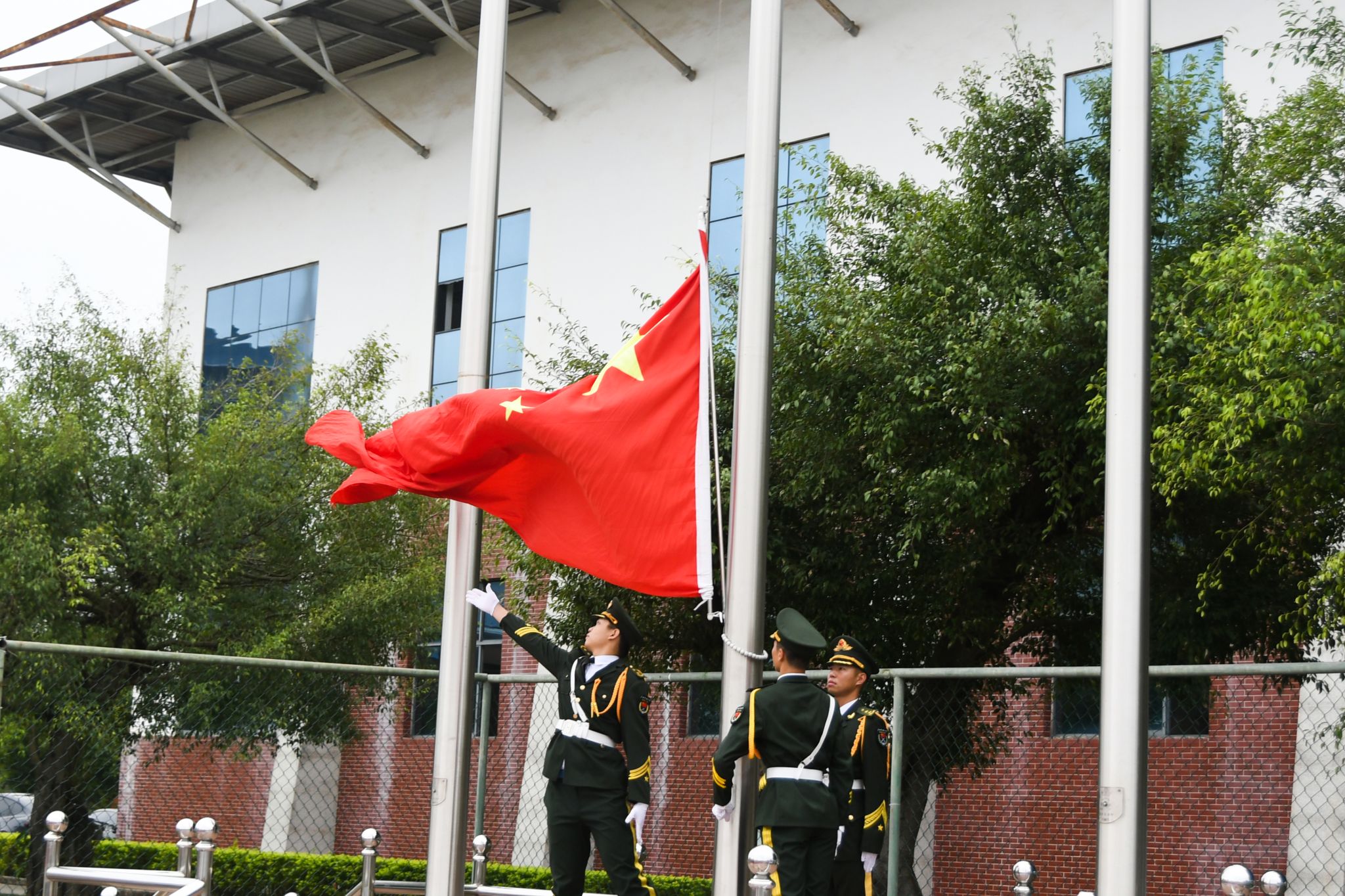 上午8时整,国旗护卫队迈着铿锵有力的步伐,精神抖擞、英姿飒爽,护送国旗入场。在庄严的《义勇军进行曲》中,擎旗手挥臂展旗,鲜艳的五星红旗冉冉升起,全体师生庄严肃立,齐唱国歌,以崇敬之心表达对祖国的深切祝福与无限热爱。