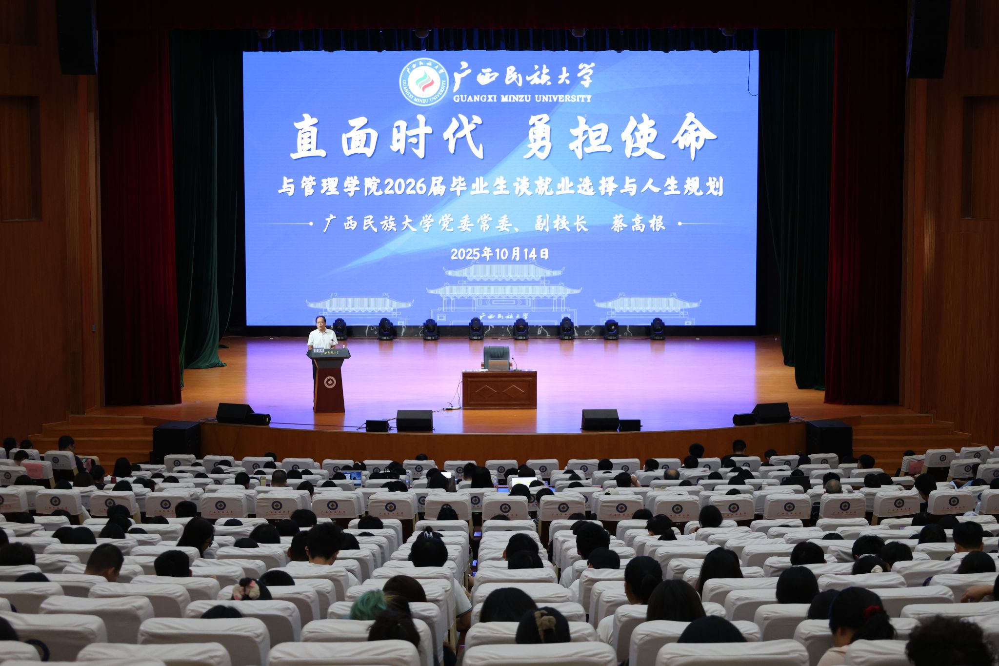 10月14日,蔡高根在管理学院2026届毕业生就业专题辅导讲座上表示,选择的底气来源于平时的积累与能力的储备,同学们在时代变革中要主动作为,改变思维,在识变应变中开拓进取;改变心态,在行动中成长;改变格局,将个人发展融入国家需求;改变轨迹,多渠道实现人生价值。(初审/陶日然 图文/莫雨静 编/梁晶晶 复审/韦利坤 终审/孙寿媚)