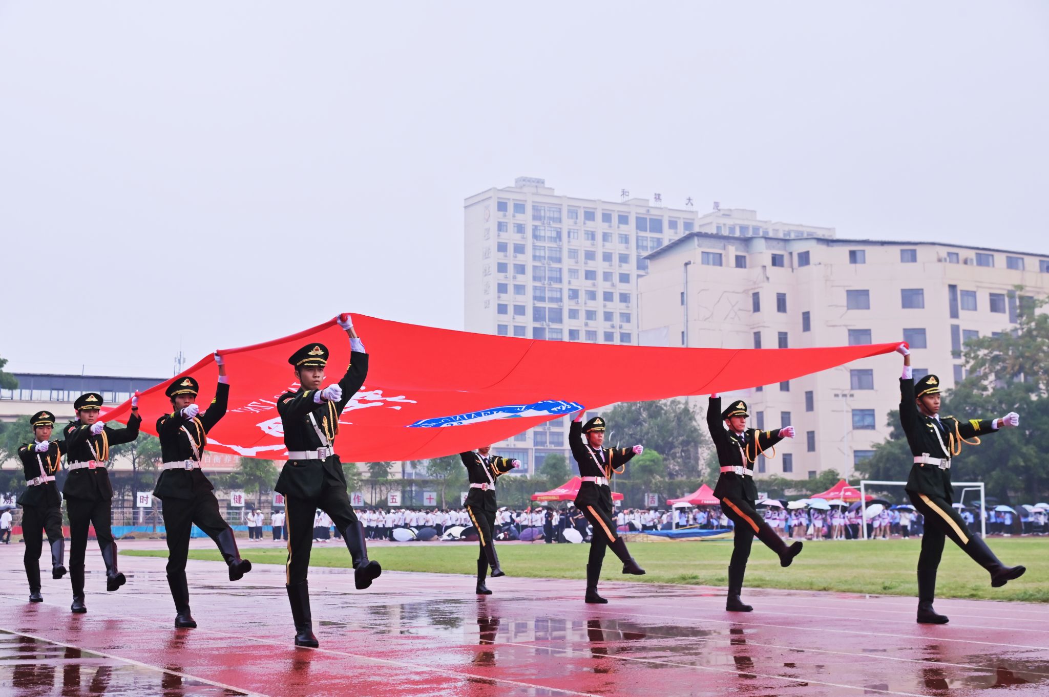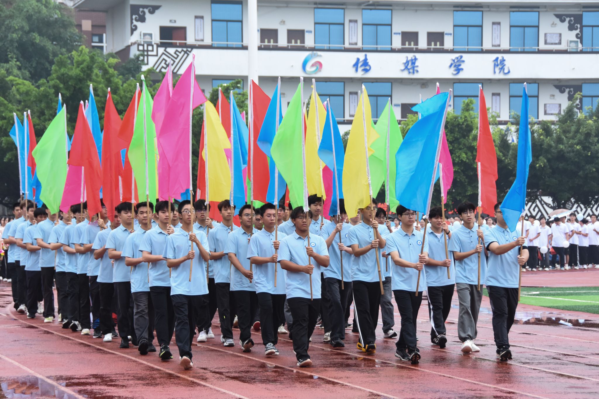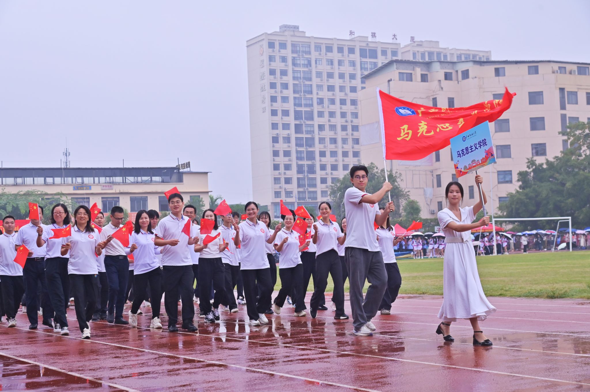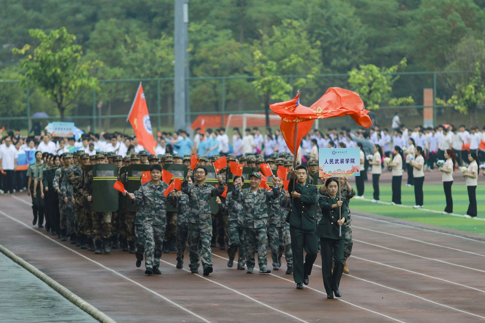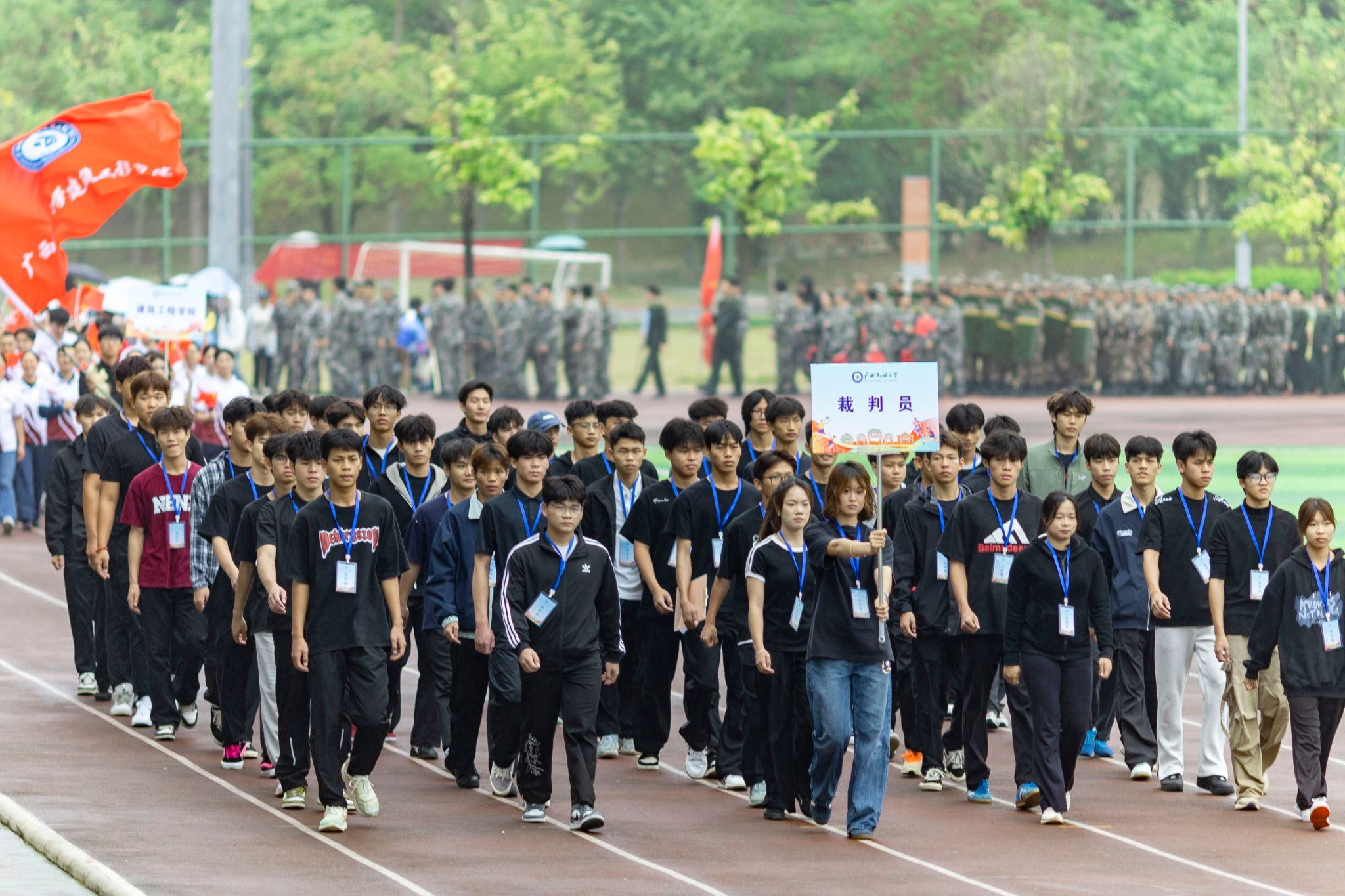 伴随着激昂的《运动员进行曲》,国旗方队、校旗方队、彩旗方队、鲜花方队、裁判代表队及各学院代表队依次入场,他们步伐铿锵、意气风发,展现出民大师生锐意进取的精神风貌。