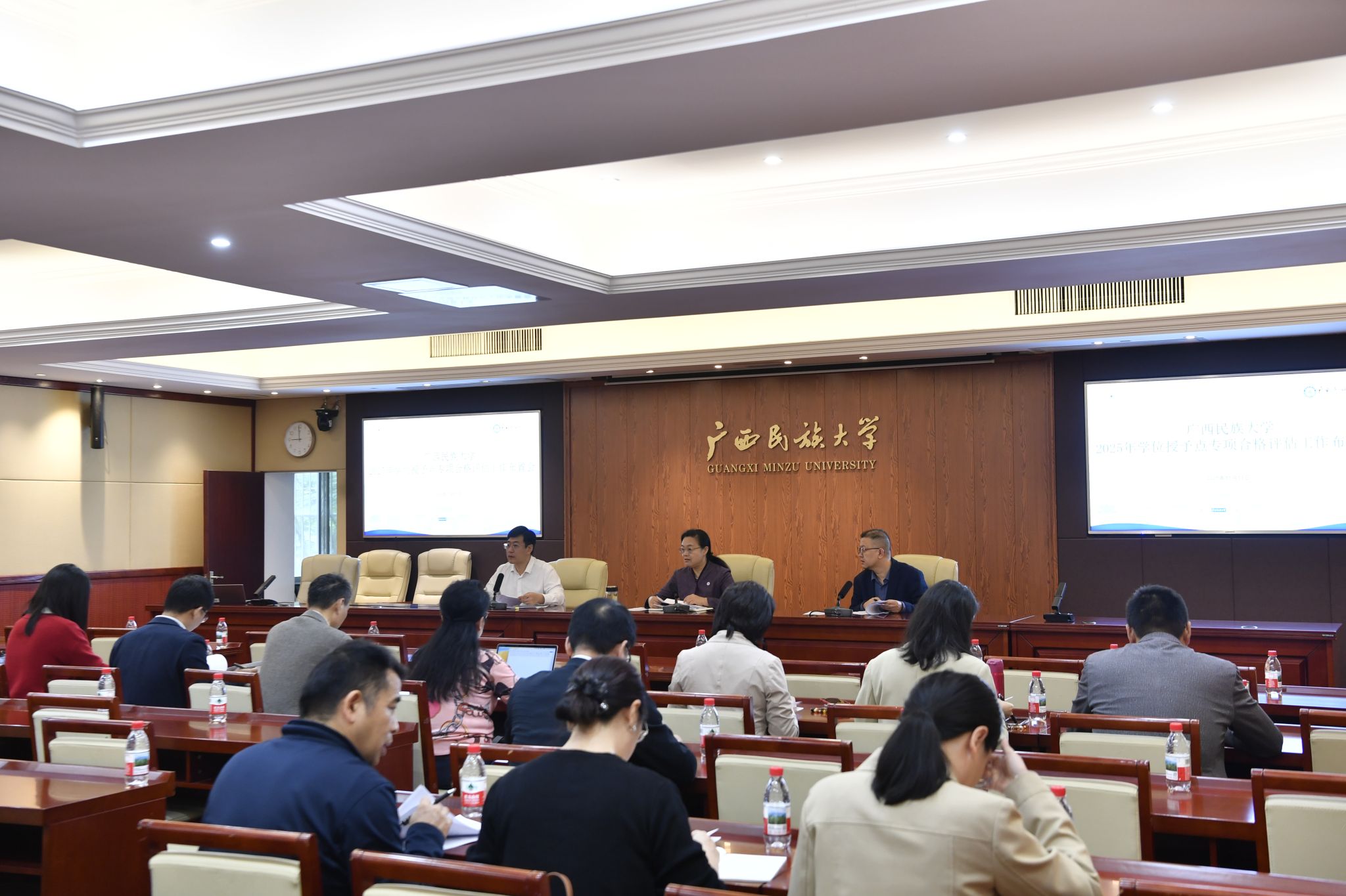 韦仕珍就评估工作作部署。她强调,各单位须精准把握评估导向,严格对标完善材料,强化跨部门协同与资源整合,重点保障人才、经费、场地等核心要素合理配置与合规使用;聚焦学位点建设目标,强化成果梳理与资源统筹,促进学科建设与交叉学科深度融合;严格压实工作责任,加强部门协同,确保专项评估工作高质量完成。