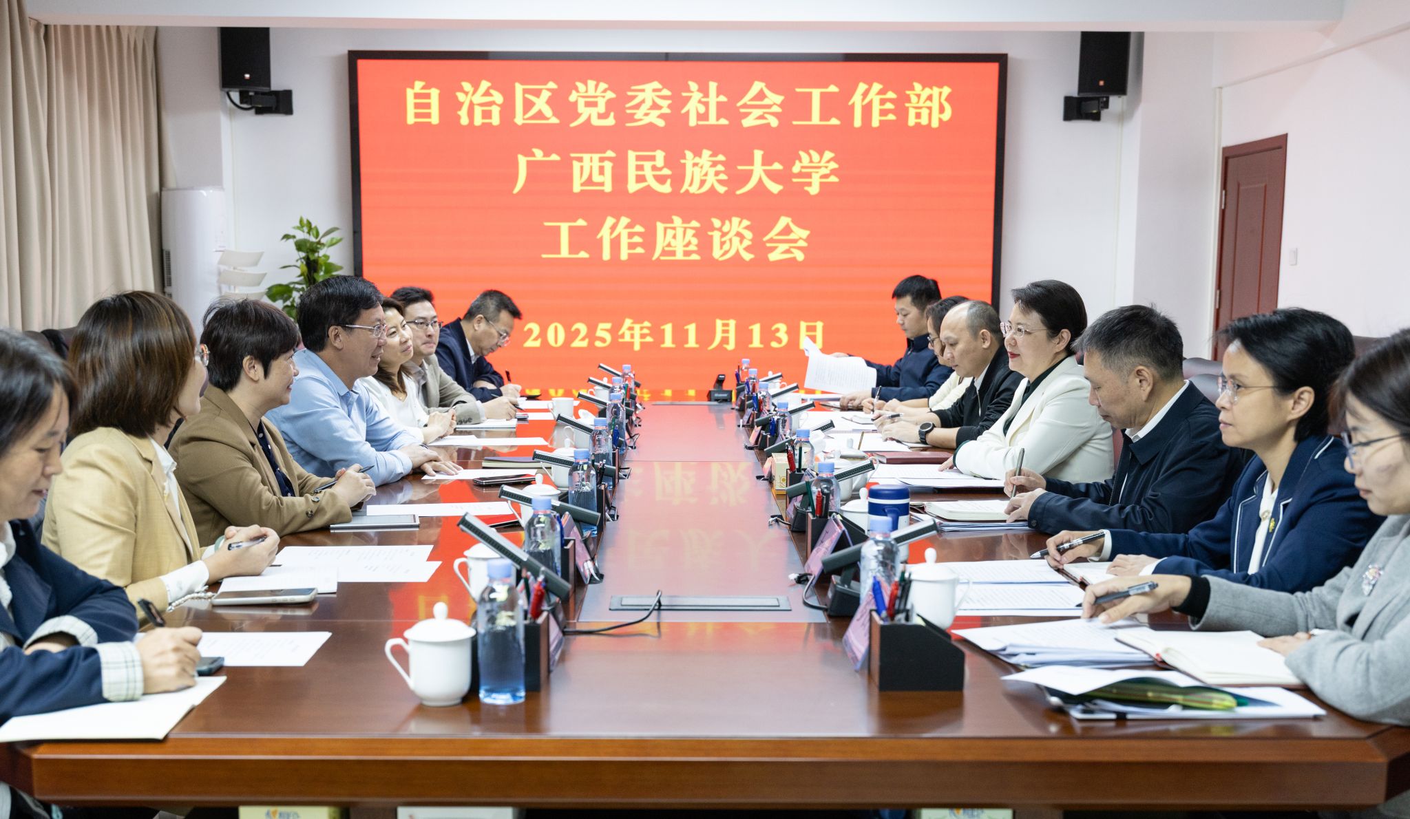 11月13日,beat365英国官方网站党委书记唐平秋带队赴自治区党委社会工作部调研。自治区党委社会工作部部长、“两新”工委书记唐轶昂,自治区党委社会工作部副部长文琦出席座谈会。