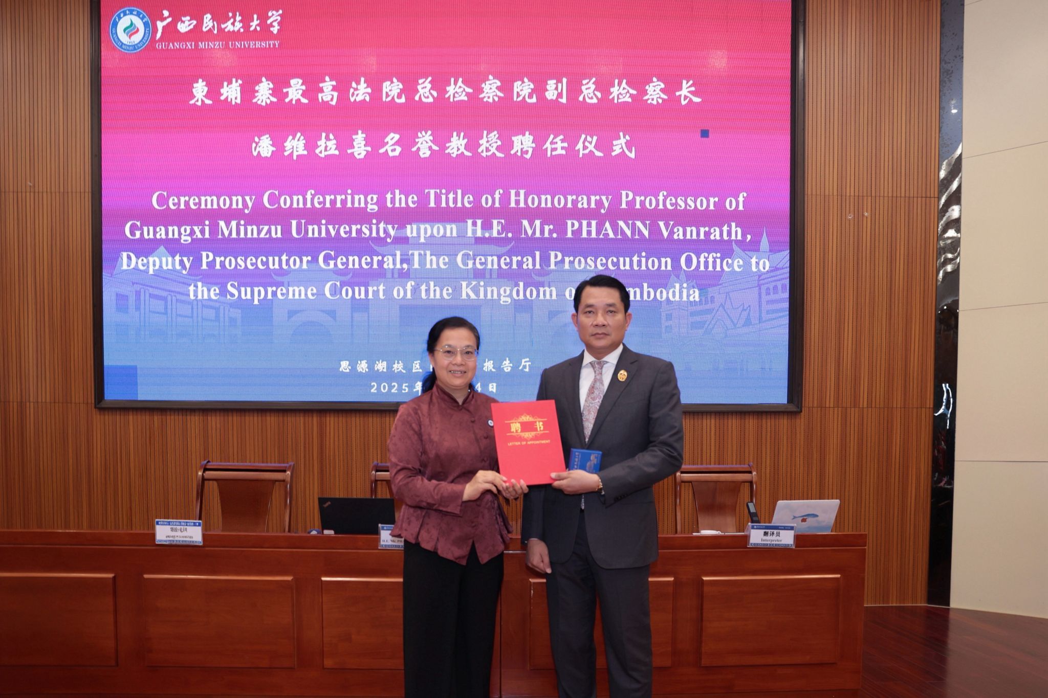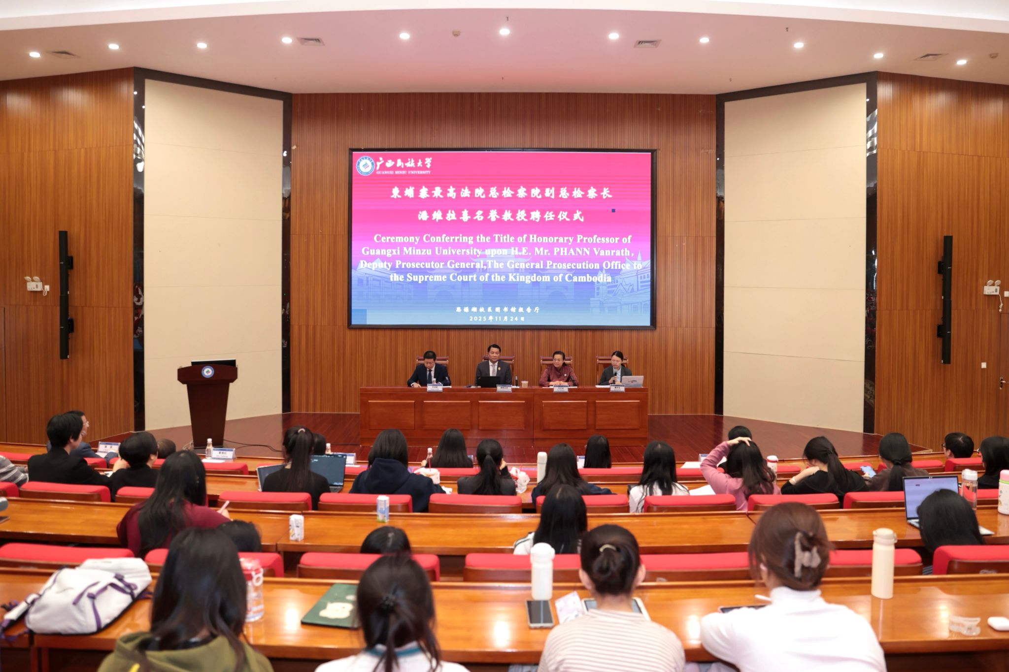 【大学生通讯社报道】11月24日下午,beat365英国官方网站在思源湖校区图书馆二楼报告厅举行名誉教授聘任仪式,聘任柬埔寨最高法院总检察院副总检察长潘维拉喜(H. E. PHANN VANRATH)为名誉教授,校长韦仕珍出席仪式并为潘维拉喜颁发聘书。校党委副书记、中国-东盟法学院院长邓国彬出席并主持仪式。