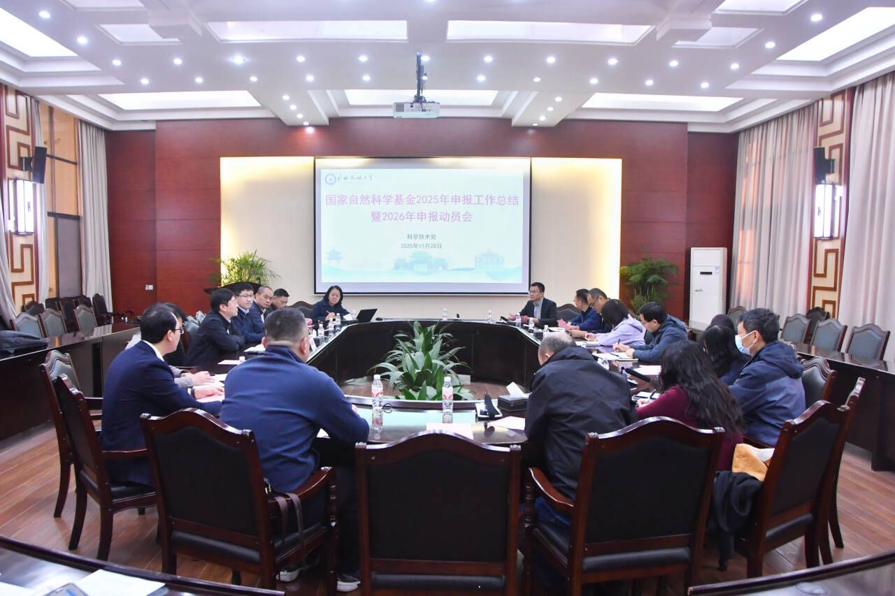11月28日,校党委常委、副校长高兴宇在主持召开国家自然科学基金2025年度工作总结暨2026年度申报动员会上表示,有关部门负责人要提高站位,高度重视国家级项目申报工作,以学科方向为引领做好有组织科研,强化科研支撑学科建设发展,突出区域特色、精准对接广西地方产业需求。(初审/梁桂娥 图文/农可盈 编/韦丽娜 复审/韦利坤 终审/孙寿媚)