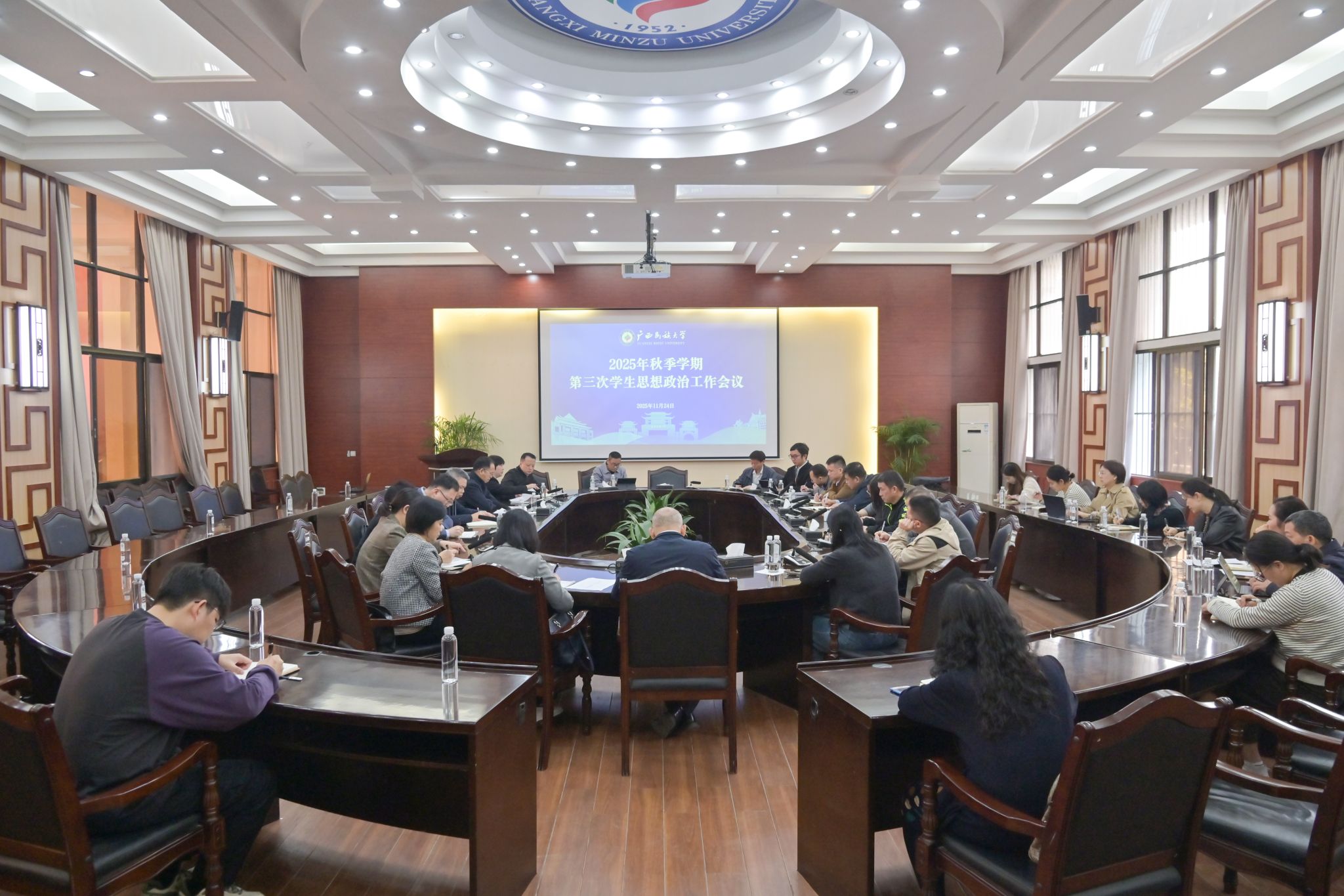11月24日,陈铭彬在学生思想政治工作推进会议暨11月份就业工作推进会议上强调,要筑牢学生安全与意识形态防线,加强教育引导与督查落实,有关学院要切实履行主体责任,抓住专项招聘会等签约关键期,要着力建强辅导员队伍,落实待遇保障与成长支持,提升工作实效,推动思政工作与就业工作深度融合、提质增效。(初审/肖耀科 图/莫欣姚 文/莫欣姚 实习记者:黄琳倩 编/黎倩雅 实习编辑:樊甲利 复审/韦利坤 终审/孙寿媚)