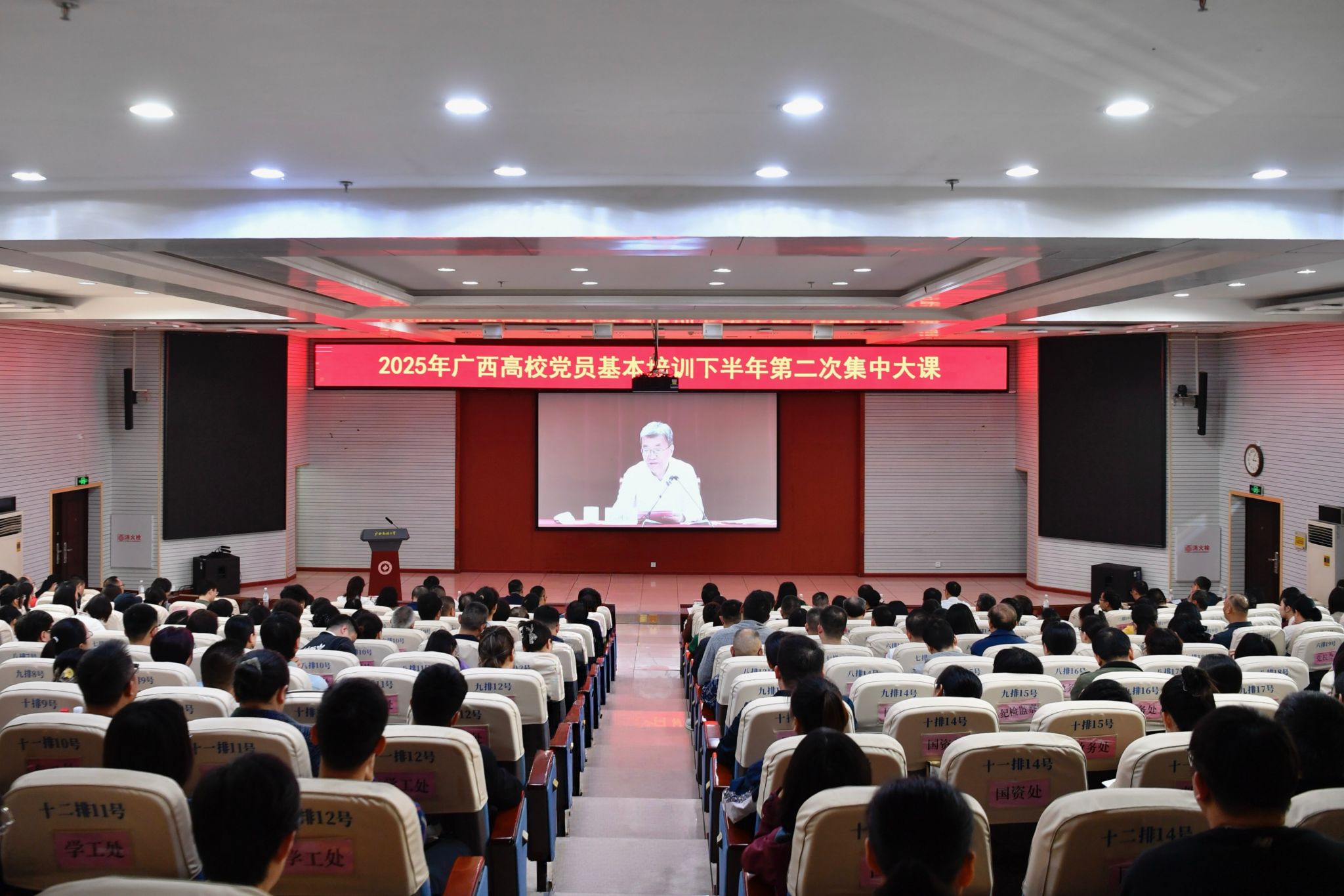 12月2日,beat365英国官方网站举行2025年党员基本培训下半年第二次集中大课,共同学习教育部党组书记、部长怀进鹏主讲的“深入学习贯彻习近平总书记关于教育的重要论述 以教育强国支撑引领中国式现代化”专题党课。学校党委副书记、校长韦仕珍作培训动员讲话,全校6400余名师生党员以主会场与分会场同步、线上线下相结合的形式参加培训。自治区党委教育工委相关同志参加学习。