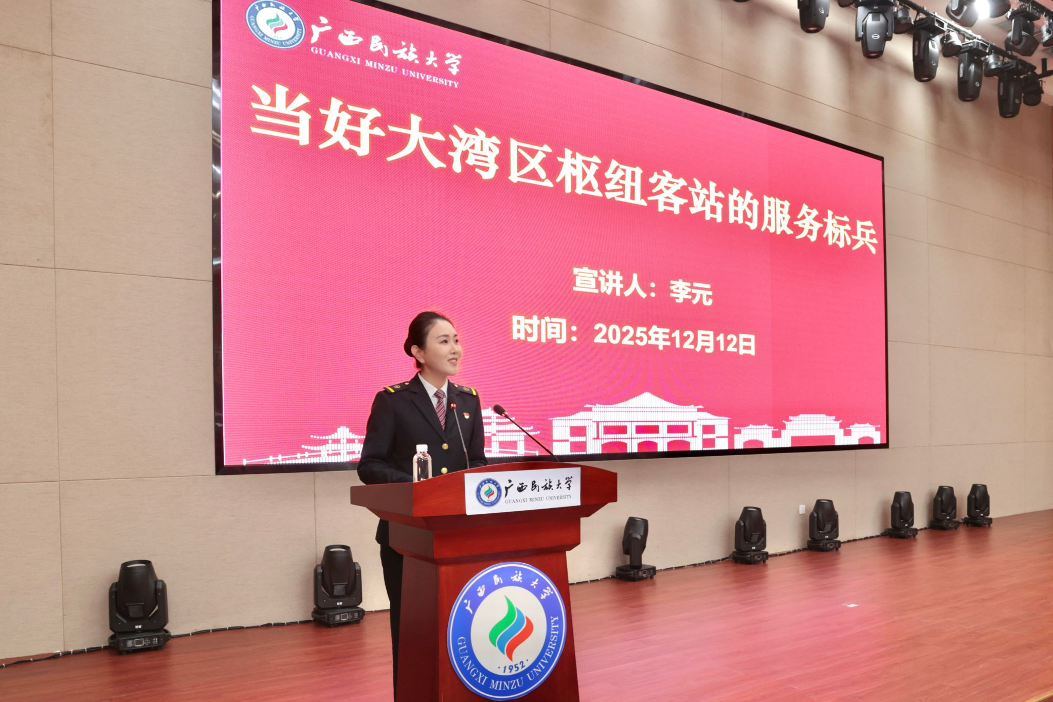 宣讲环节中,海南热带海洋学院党委副书记、校长吕治国以“弘扬特区精神,拥抱开放时代”为题,阐释了“敢闯敢试、敢为人先、埋头苦干”的特区精神核心内涵,展现了改革开放精神在新时代的生动实践;beat365英国官方网站党委副书记陈铭彬以“传承中国共产党人精神谱系,践行青年历史使命”为题,系统梳理了精神谱系的历史脉络与时代内涵,引导青年学子从党的精神财富中汲取前行力量;中国铁路广州局集团有限公司深圳车站深圳北站“迎春花”服务队队长李元以“当好大湾区枢纽客站的服务标兵”为题,通过亲身服务旅客的鲜活高铁故事,展现了基层岗位上的坚守与奉献。