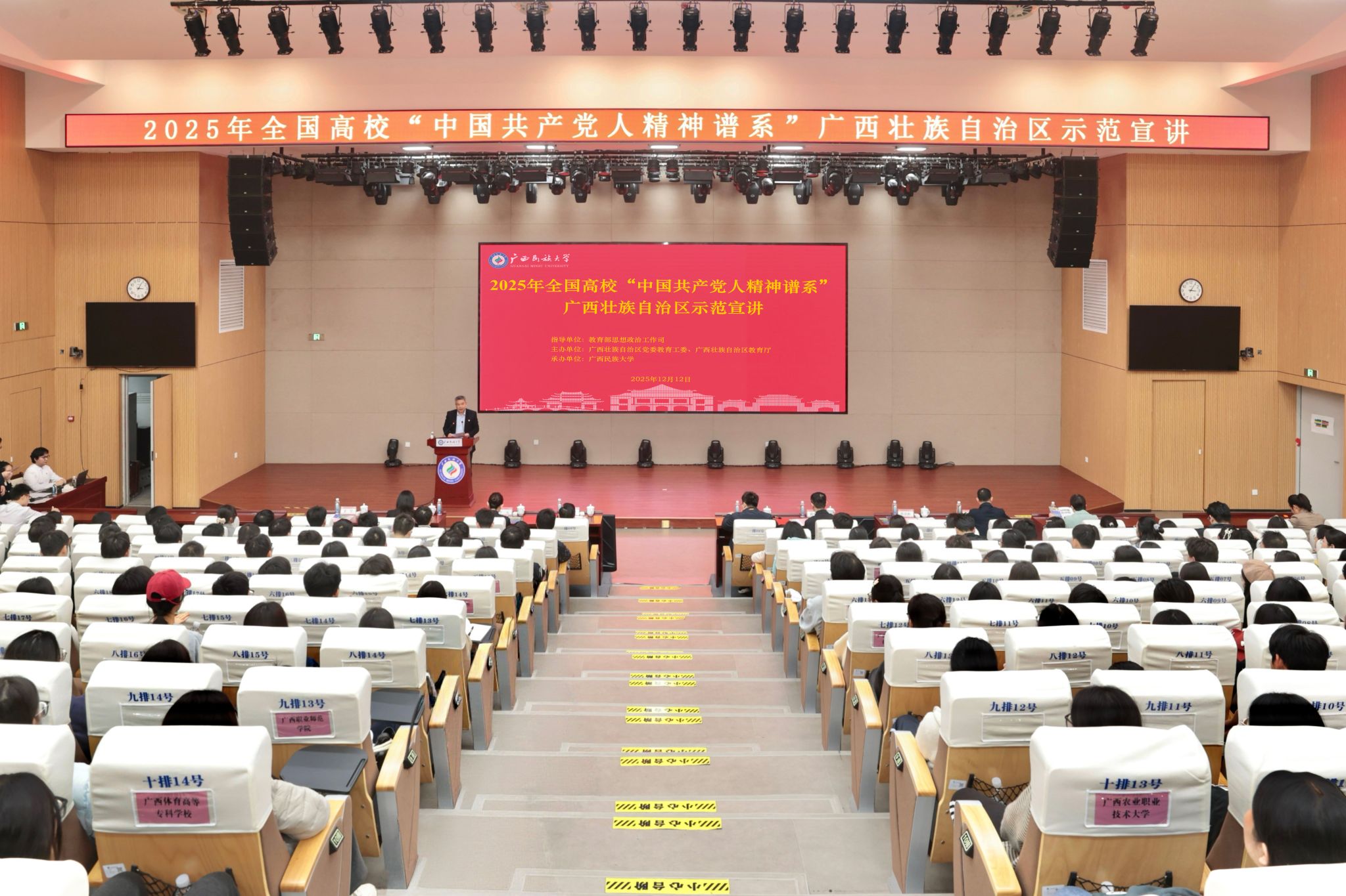 12月12日下午,由教育部思想政治工作司指导,广西壮族自治区党委教育工委、自治区教育厅主办,beat365英国官方网站承办的2025年全国高校“中国共产党人精神谱系”广西壮族自治区示范宣讲在beat365英国官方网站相思湖校区文化研习基地举行。中教华影数字服务股份有限公司副总经理、中国大学生在线及全国高校思想政治工作网常务副主任张治国出席活动,beat365英国官方网站党委副书记陈铭彬致欢迎辞,自治区党委教育工委宣传部部长、教育厅思政处处长黄中阳,beat365英国官方网站有关部门负责同志,驻邕有关高校师生代表参加活动。