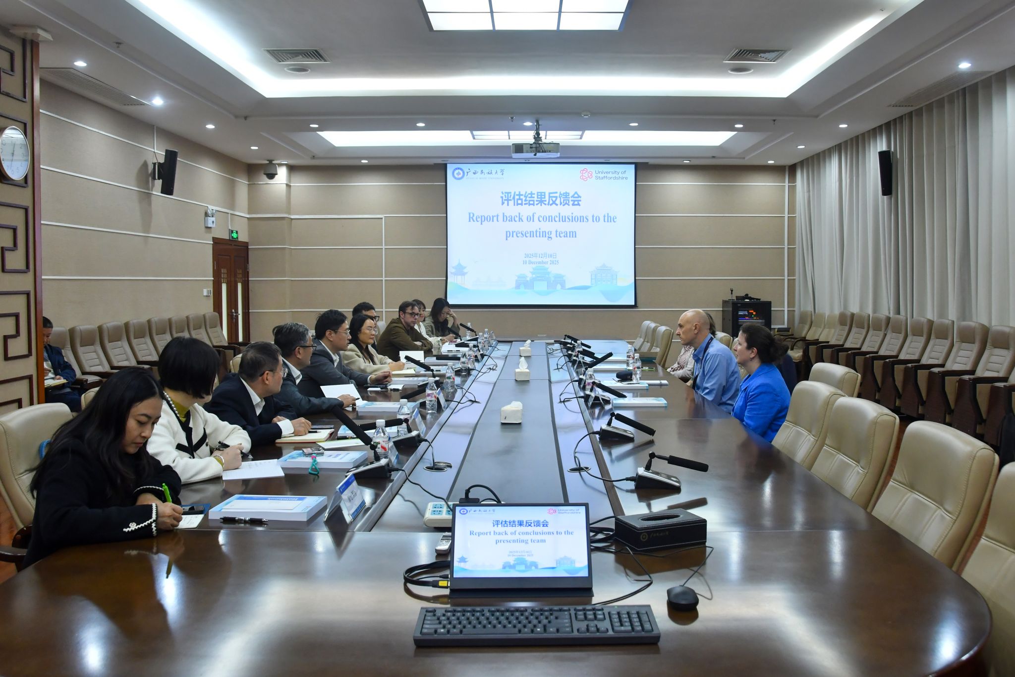 12月10日,高兴宇在英国斯泰福厦大学评估组反馈总结会上表示,评估组专家以严谨的态度和务实的作风,通过实地考察、深度访谈、资料审阅等方式全面评估项目的办学质量,对学校项目推进给予了专业反馈与建设性意见。针对当前存在的问题,学校将成立专项整改小组,制定整改方案,明确责任与分工,确保问题有效解决。(初审/曲用心 图文/陈昱冰 编/梁晶晶 实习编辑:梁火琼 杨诗琦 复审/韦利坤 终审/孙寿媚)